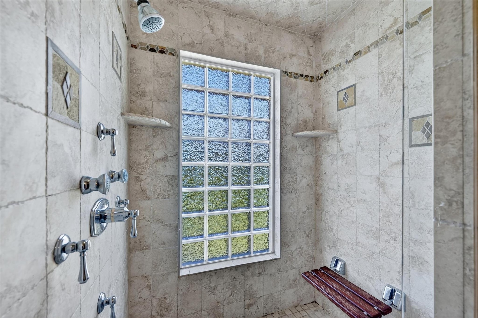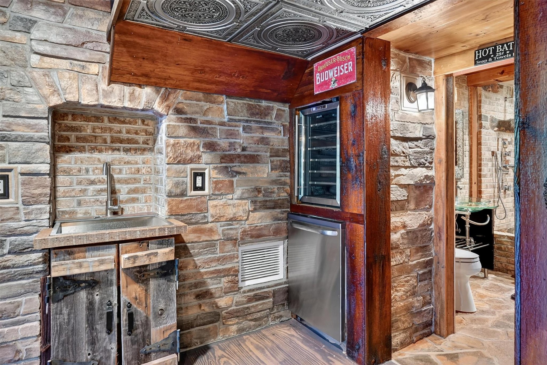 - Bathroom with brick wall, wooden ceiling, a tile shower, and stone finish floors