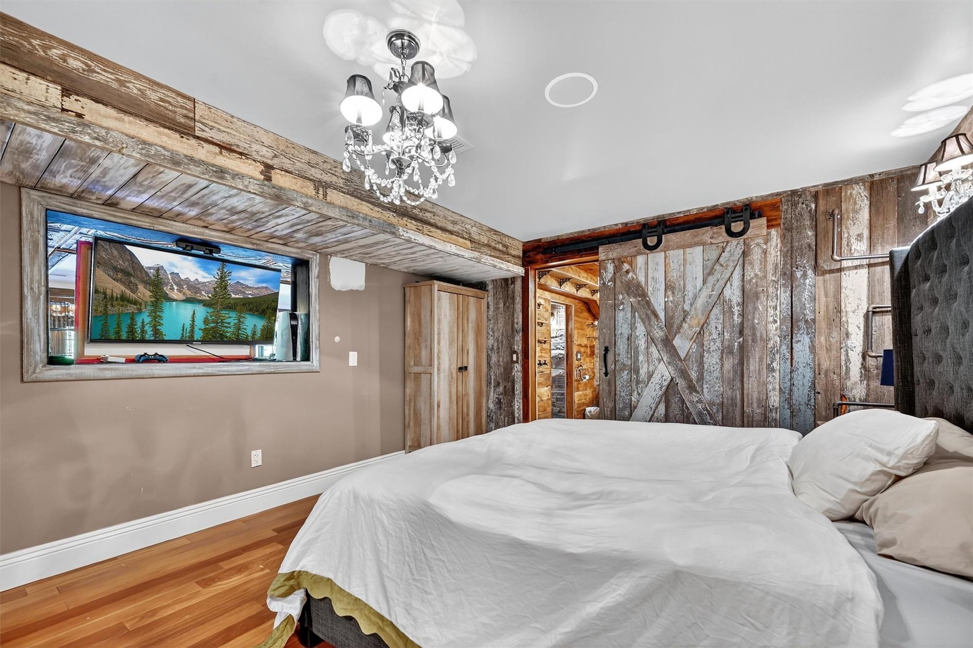 - Bedroom featuring wood finished floors, wood walls, and a chandelier
