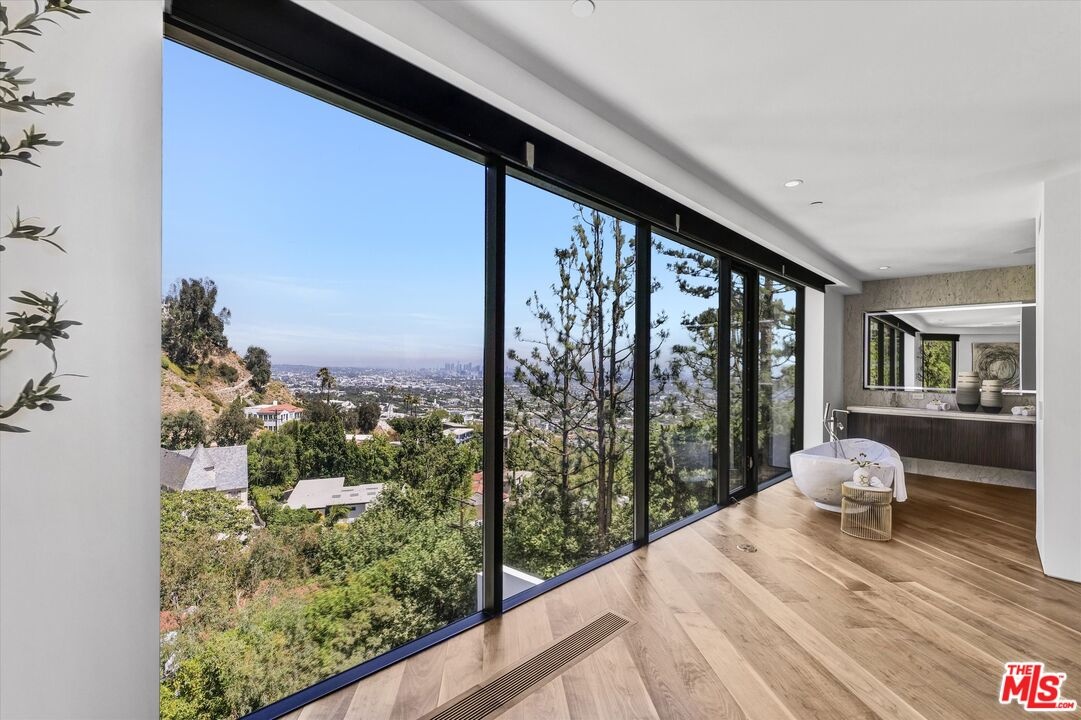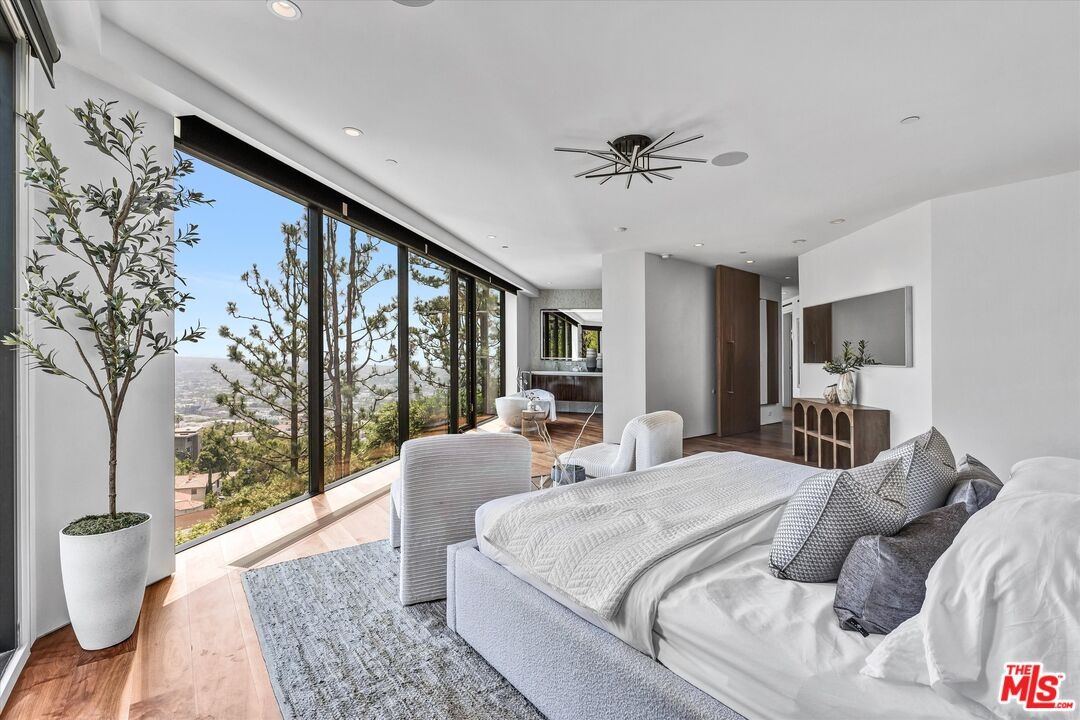 Welcome to modern luxury perched in the iconic Hollywood Hills! This newly completed contemporary masterpiece offers, featuring 4 bedrooms, 5 baths, and breathtaking panoramic views of Los Angeles and the Downtown skyline. Designed for seamless entertaining and everyday comfort, the home showcases a chef's kitchen equipped with top-of-the-line Wolf appliances, Italian tile accents, and sleek hardwood floors throughout. A stunning architectural waterfall cascades through the center of the home, creating a serene focal point and elevating the modern aesthetic. Enjoy an unparalleled entertainment experience with a dedicated media room, bar room, integrated surround sound system, and smart home technology controlling lighting, music, and climate. Luxurious spa-inspired baths include a steam shower for ultimate relaxation. Two expansive decks capture sweeping city views, while the exceptionally rare, flat 2,500 sq ft backyard provides valuable usable space perfect for outdoor entertaining, lounging, or the addition of a pool to complete your personal oasis. Additional highlights include a versatile guest house above the garage, ideal for visitors, extended family, or creative use. Parking includes a two-car garage plus a carport for added convenience. Perfectly located north of the Sunset Strip and moments from the vibrant energy of the Comedy Store, world-class dining, nightlife, and Runyon Canyon hiking trails, this Hollywood gem delivers the quintessential LA lifestyle.
