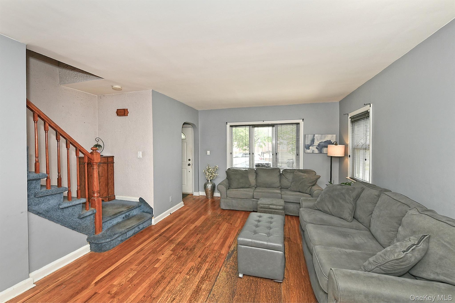 - Living area featuring wood finished floors, stairs, and arched walkways