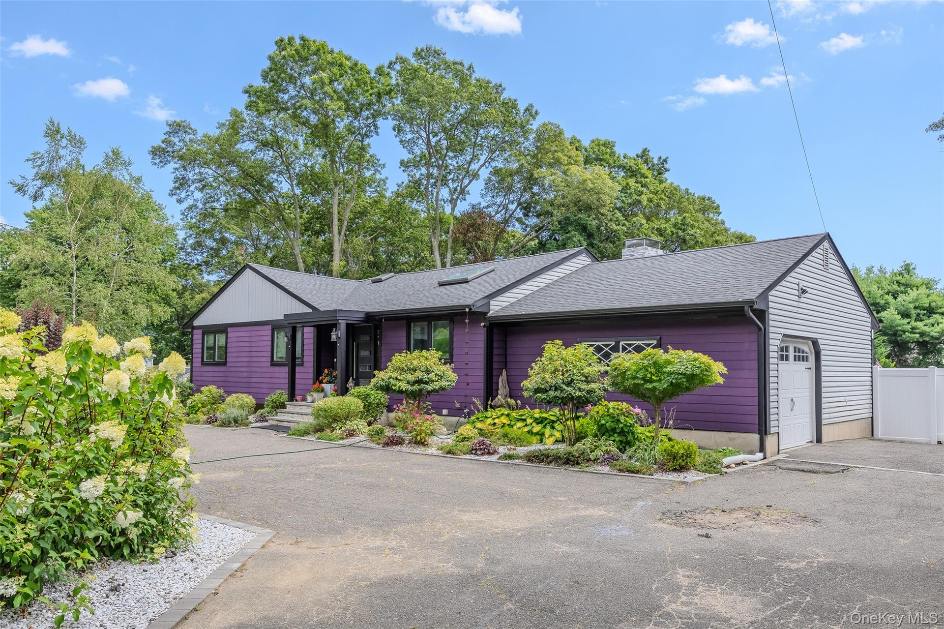 Fully renovated in 2019, this bright and spacious ranch in Islandia/Hauppauge offers over 2,000 sq ft of modern living on a 0.64-acre fenced lot. Upgrades include new roof, windows, doors, siding, plumbing, electrical, HVAC, and high-end interior finishes throughout. Revel in mealtime prep in this deluxe chef's kitchen, complete with Bertazzoni gas range, stainless steel appliances including vent hood, pot filler faucet, garbage disposal, quartz counters, oversized island with vegetable sink and power, and soft close cabinetry with ample storage. Open-concept kitchen overlooks the expansive single-floor living space with gorgeous crown molding and skylights and two sets of double french doors that bathe the room in natural light. A two-sided gas fireplace grounds the space and helps make this beautifully finished house a home. Other desirable features include central air conditioning, first floor laundry, a primary en suite bathroom, and full basement. Both spa-like bathrooms have showers that are ADA accessible. Open the french doors to the wrap around deck with multiple seating areas for backyard relaxation. This .64 acre property features a single car attached garage, extended driveway with parking for 12+, multiple sheds, automatic opening gate, beautiful landscaping, and room for a pool. This home is ADA accessible and minutes from the LIE and shopping. Bonus spaces are perfect for multi-generational living, in-law suites, guests, or a home office—truly a must-see! Located in the Hauppauge School District with low taxes and no HOA. Move-in ready and full of possibilities.