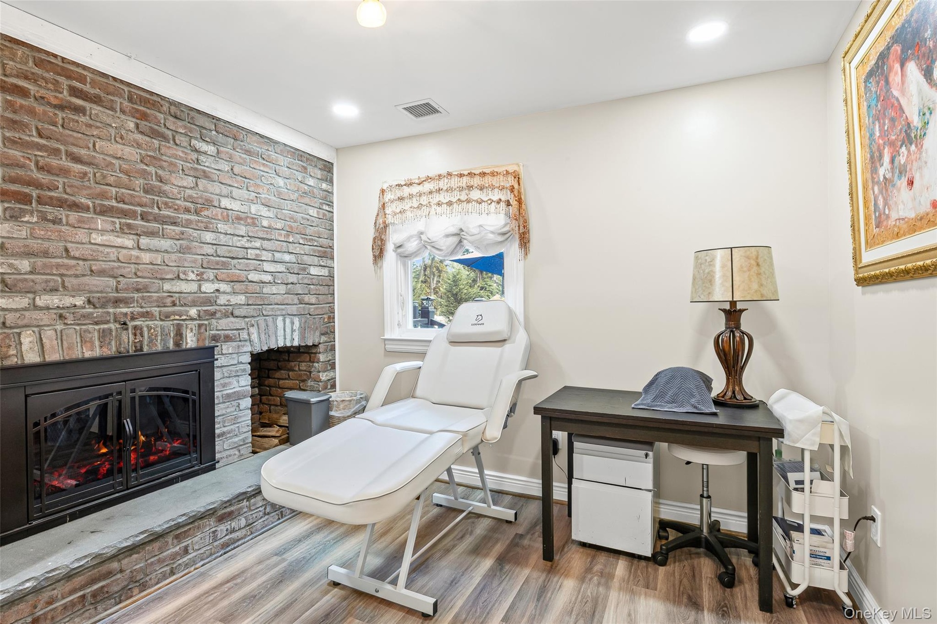 - Office space with wood finished floors, a brick fireplace, and recessed lighting