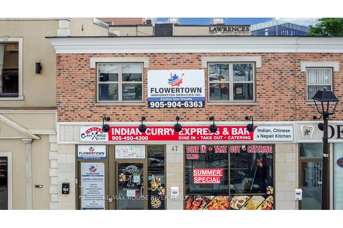 Welcome to 47 Queen St W #1, located in the vibrant heart of Downtown Brampton! This charming restaurant is an exceptional opportunity for a fully equipped restaurant in the heart of Downtown Brampton. Located in a high-exposure area with excellent signage. Licensed by LLBO - 59 Seats. Four wash rooms & one Parking available. Fully Equipped Kitchen. Just steps from Brampton City Hall. Surrounded by condominiums, and top entertainment venues. The location offers unmatched exposure and accessibility. The space is fully equipped for continued success.
