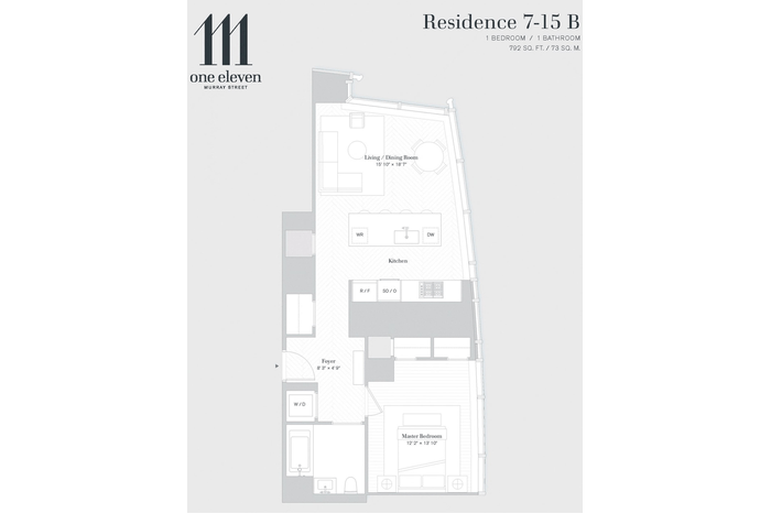Luxury 1-bedroom, 1 bathroom at TriBeCa's newest global landmark condominium.11B residence offers both north and east exposures overlooking the exquisite landscape architecture of Edmund Hollander. Enter through the foyer that leads you to this meticulously designed 792 square feet space that feature 10'7 ceiling height, white oak herringbone floors and glass-wrapped corner living/dining room, flooded with exceptional natural light. Enjoy a seamless entertaining with center island breakfast bar open kitchen designed by AD100 designer David Mann. The open layout features a Calacatta Borghini marble island with book-matched waterfall, countertop, and backsplash. Outfitted in Dornbracht fixtures and top-of-the-line appliances: a Wolf range stove, Miele dishwasher, convection oven, Sub-Zero refrigerator, and wine cooler. The luxurious master bedroom suite offers east-facing exposures and a bath with radiant heat floors and custom white marble slab vanity with Dornbracht fittings and fixtures in a custom soft black matte finish. A utility closet with washer and vented dryer completes this magnificent residence. Over 20,000 square feet of private indoor and outdoor spaces span two levels, comprising state-of-the-art amenities that include two pools; a 3,000 square foot fitness center; residents" lounge; patisserie; private dining room with demonstration kitchen; wellness suite with heated stone hammam, steam room, sauna, treatment rooms, and hair salon; children's playroom with interactive Imagination Playground and adjoining catering kitchen; teen room; media room; as well as stunning landscaped gardens that seamlessly integrate the interiors and the outdoors. A world-class condominium tower located in Tribeca and developed by a partnership of Fisher Brothers, Witkoff, and New Valley. Occupying a privileged location, 111 Murray Street is surrounded by the best that Downtown has to offer.
