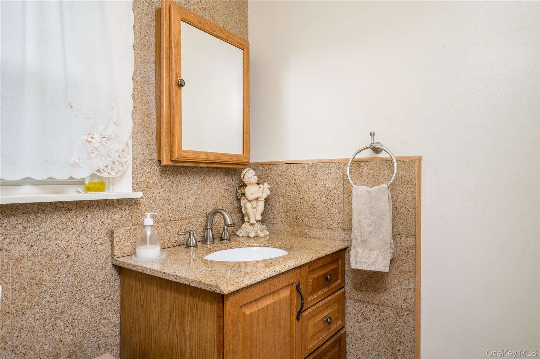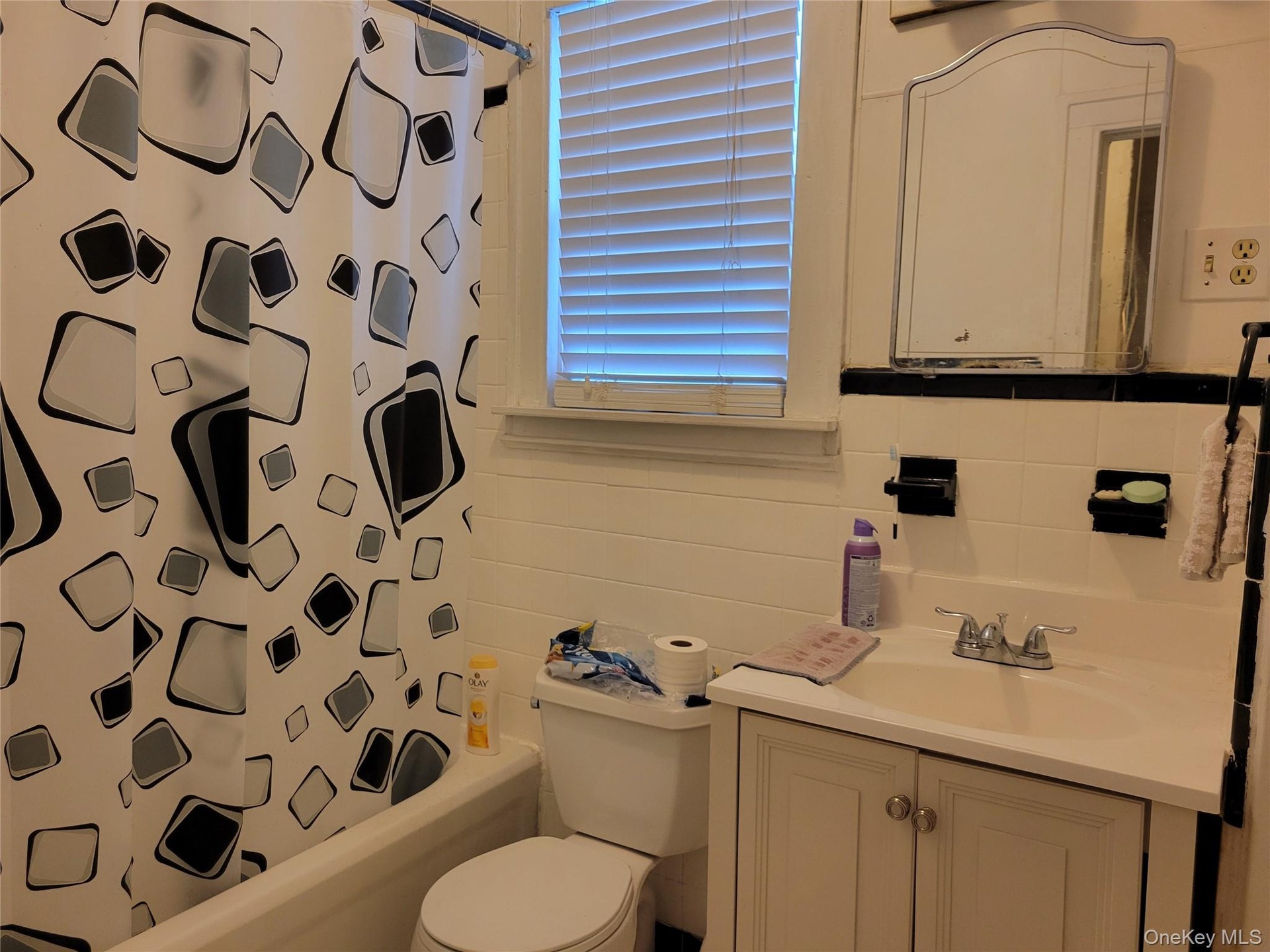 - Bathroom featuring vanity, shower / bath combo, and tile walls