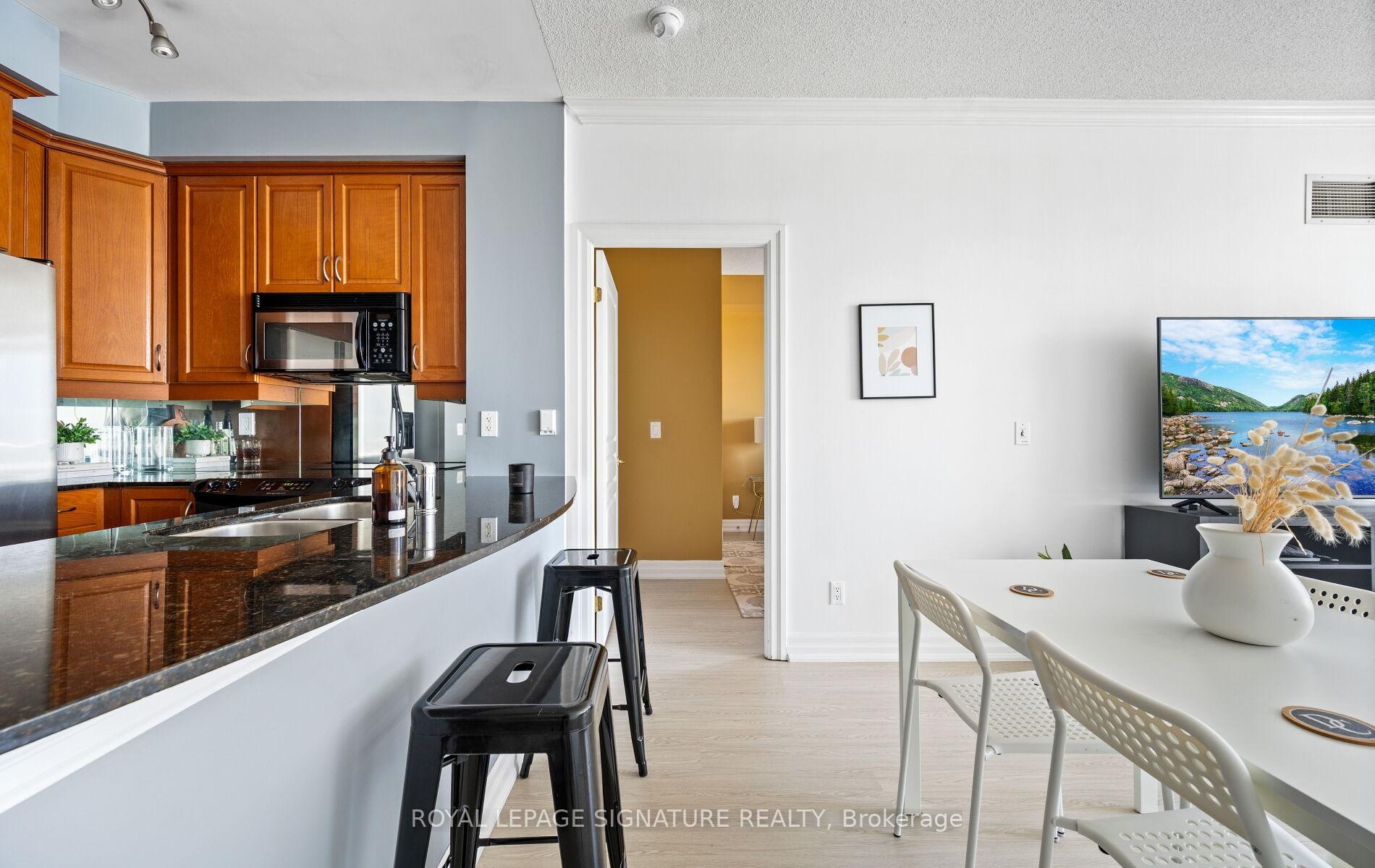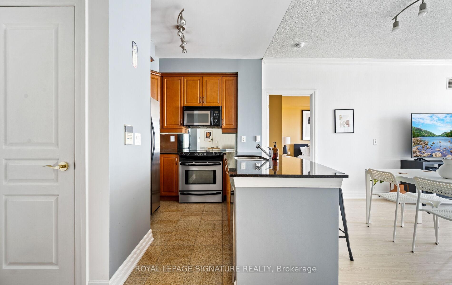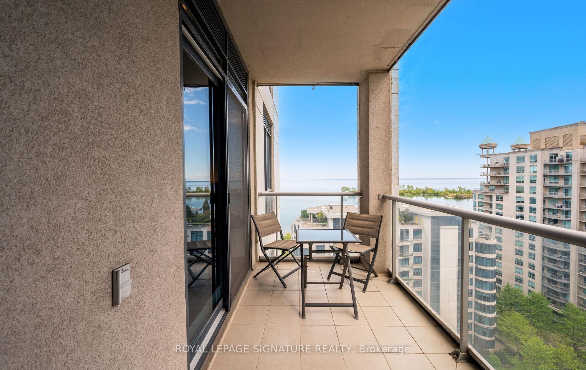 Welcome to The Waterford where sophisticated lakeside living meets urban convenience in one of Toronto's most sought-after waterfront communities. This spacious and beautifully maintained656 sq. ft. 1-bedroom condo offers a smart, open-concept layout that's perfect for both entertaining and everyday comfort. Step into a freshly updated suite featuring brand new laminate flooring throughout, adding a modern and seamless look. The contemporary kitchen is outfitted with granite countertops, mirrored backsplash, stainless steel appliances, and a breakfast bar that opens into the inviting living and dining area ideal for hosting or unwinding after a long day. Crown mouldings add a touch of elegance, and the upgraded washer/dryer offers added convenience. Walkout to your private balcony, where you can BBQ and enjoy partial lake views a rare luxury in condo living. The generously sized bedroom includes a walk-in closet with ample storage space, offering comfort and functionality in one. Whether you're working from home, entertaining guests, or enjoying peaceful lakeside mornings, this suite checks all the boxes. The Waterford is a boutique-style building known for its timeless design, upscale amenities, and unbeatable location. Just steps to the TTC, Humber Bay Park, waterfront trails, and Lake Ontario, plus minutes to the Gardiner Expressway for easy downtown access. Live your best life in Humber Bay Shores, surrounded by lush green space, vibrant cafés, restaurants, and all the conveniences of urban living all while enjoying the tranquility of the lake at your doorstep.