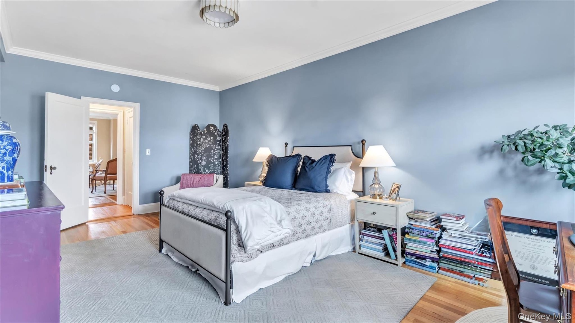 - Bedroom featuring wood finished floors, ornamental molding, and baseboards