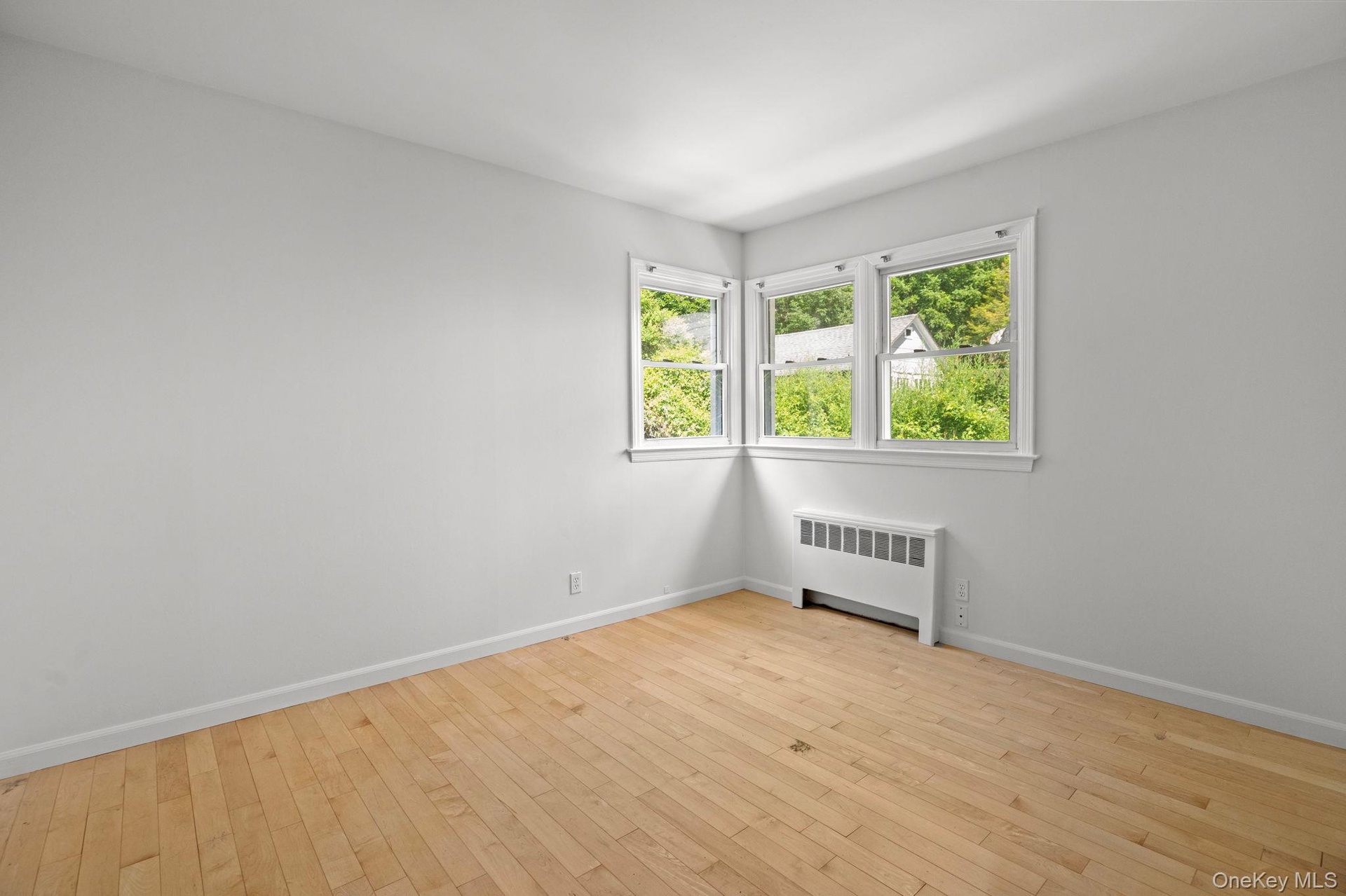 - Unfurnished room with radiator heating unit and hardwood / wood-style floors