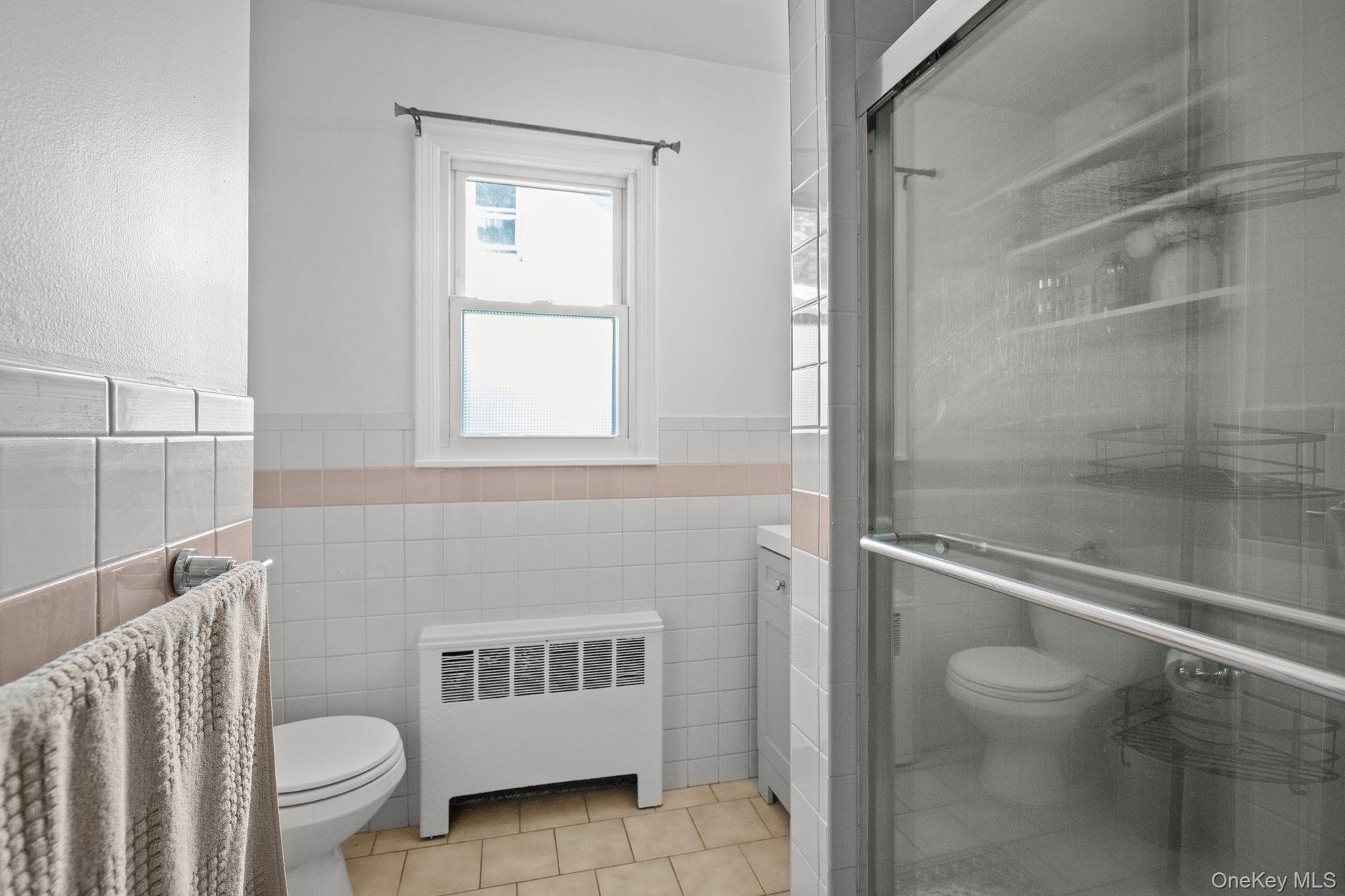 - Full bath featuring radiator heating unit, tile patterned floors, a wainscoted wall, a shower stall, and tile walls