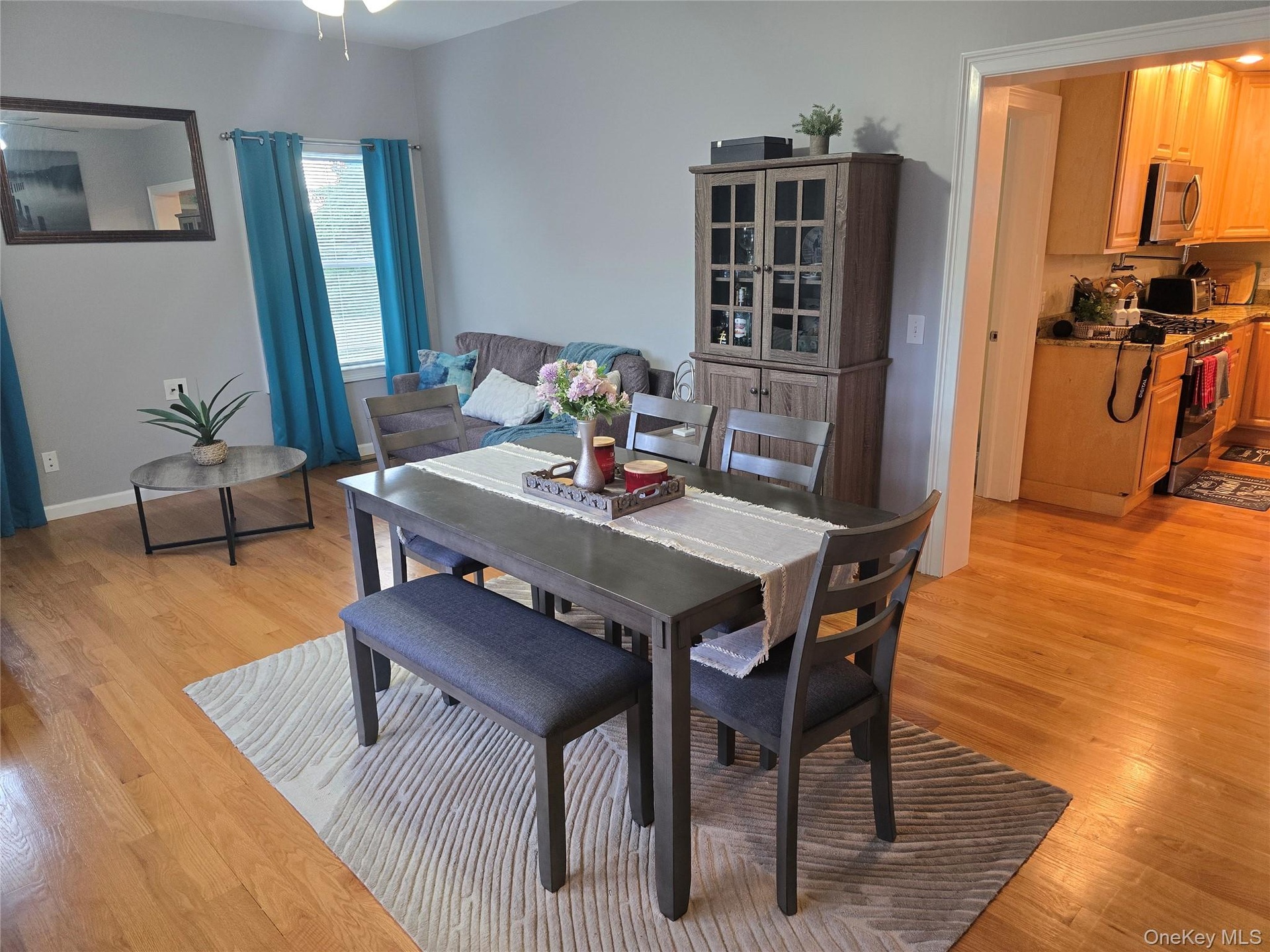 - Dining area featuring light wood-type flooring and a ceiling fan