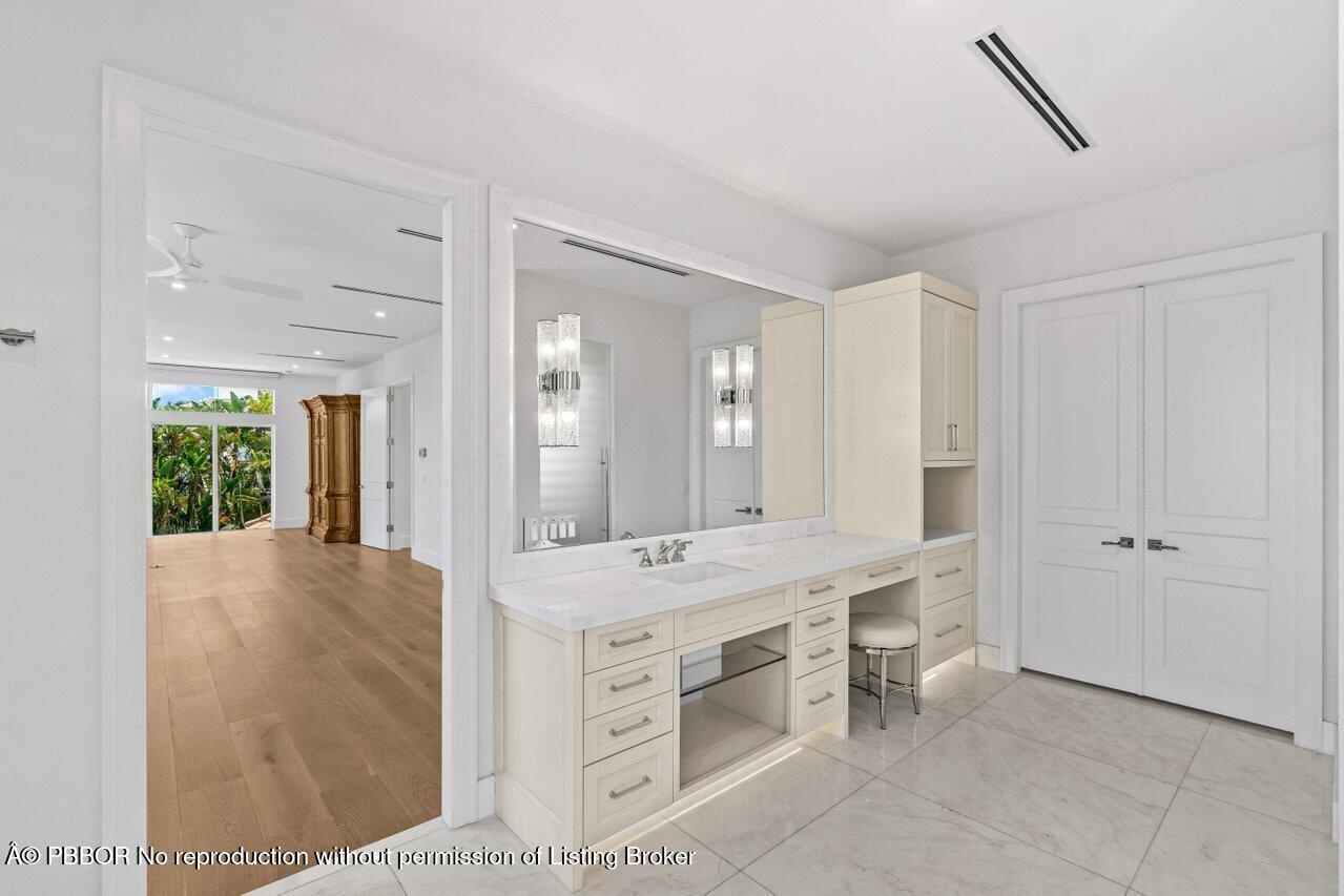 overlooking the pool. Massive primary suite on the second floor. Dual vanities, rain shower, sitting room and expansive walk-in closet with private laundry all overlooking the ocean and Intracoastal. Also on the second floor, a 1/1 guest