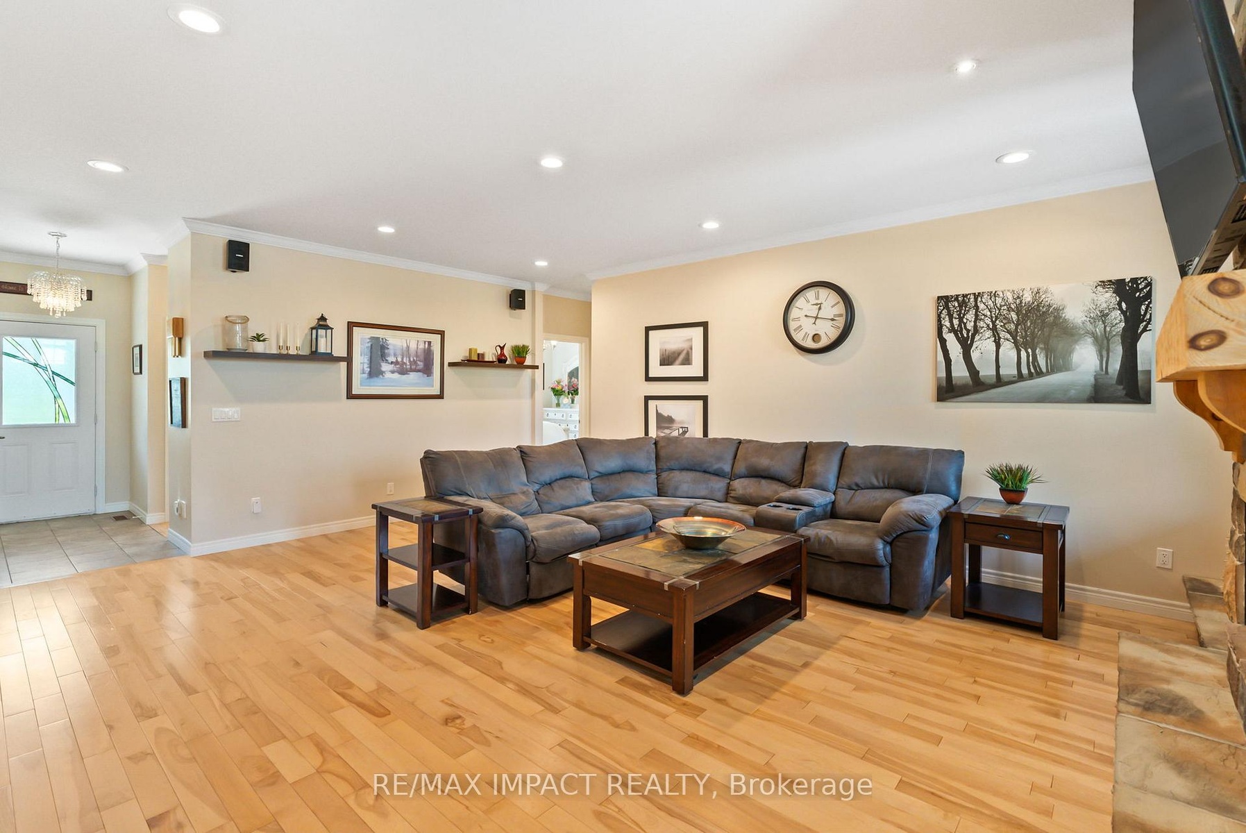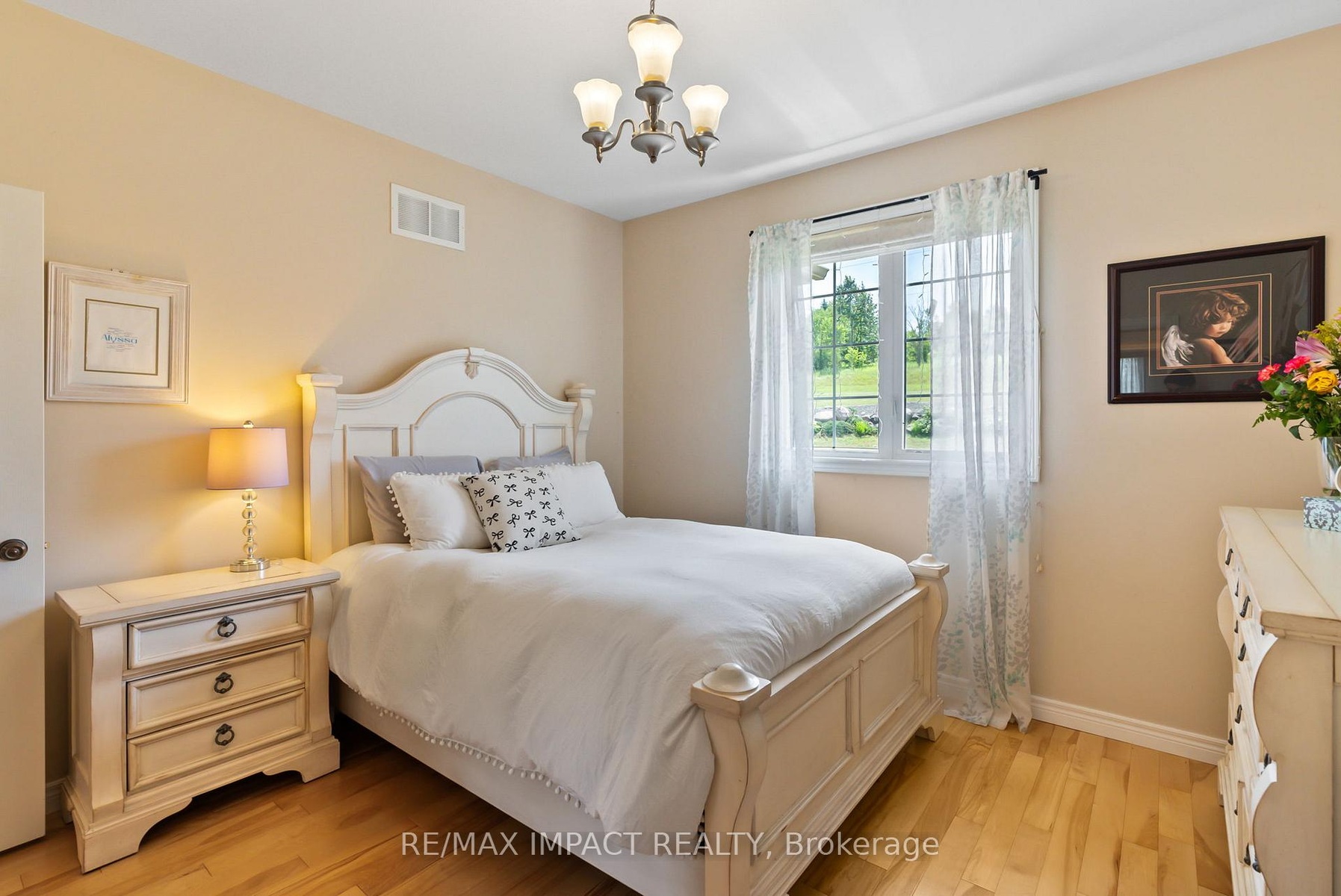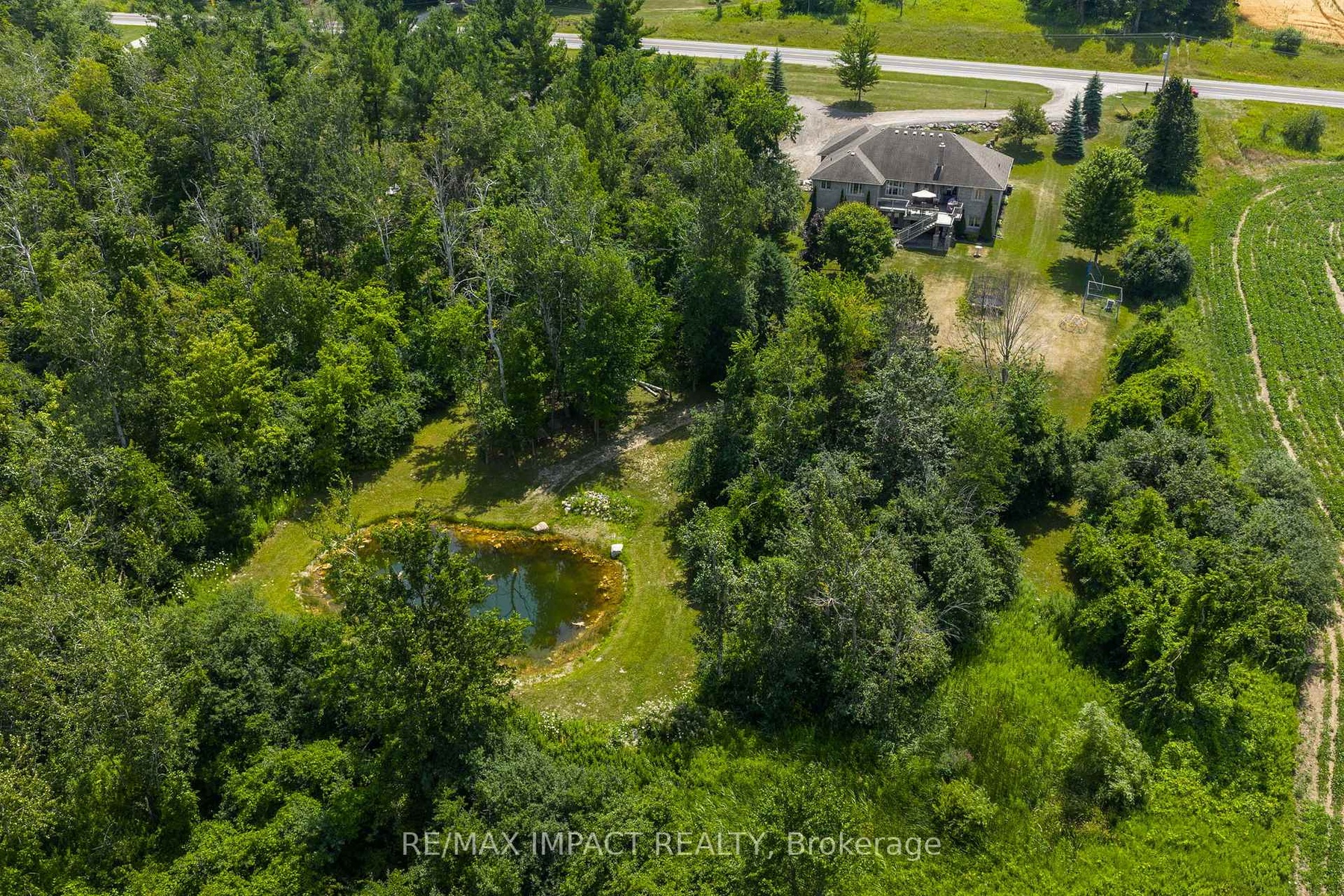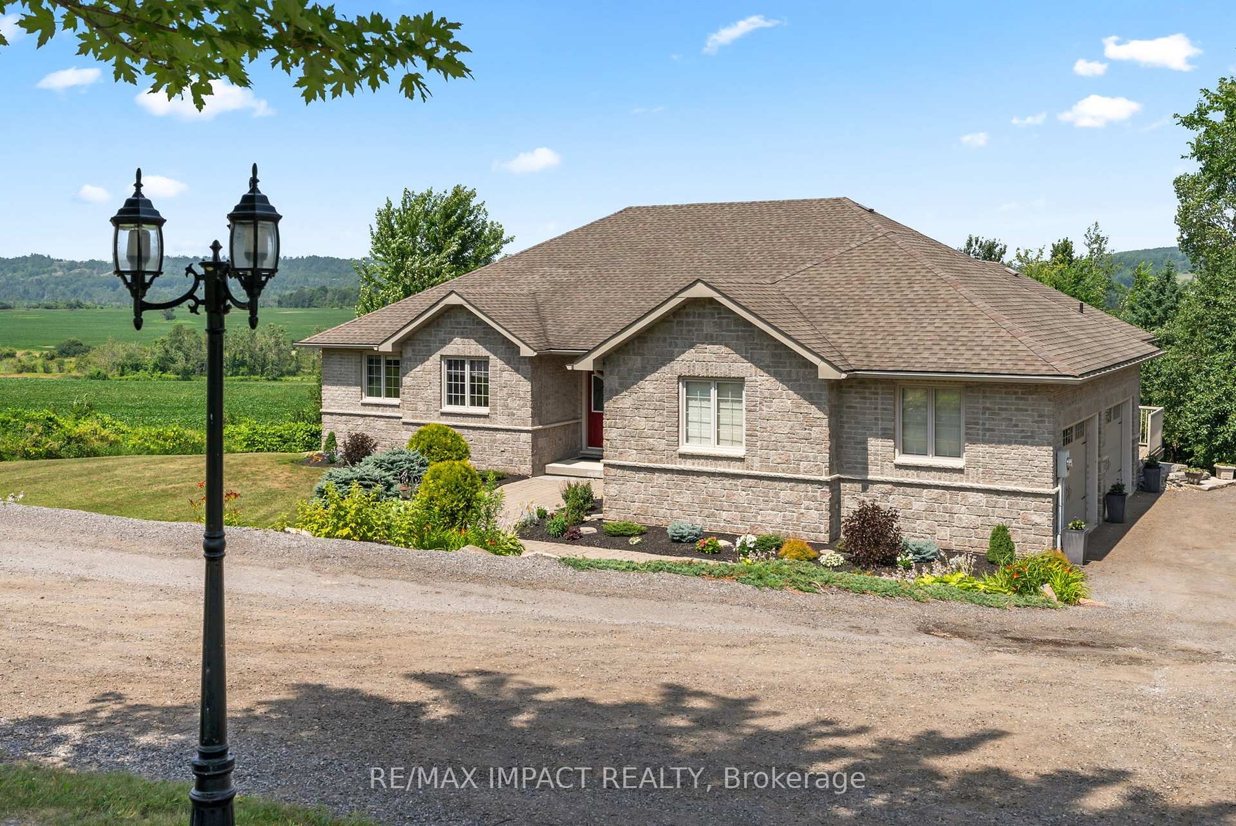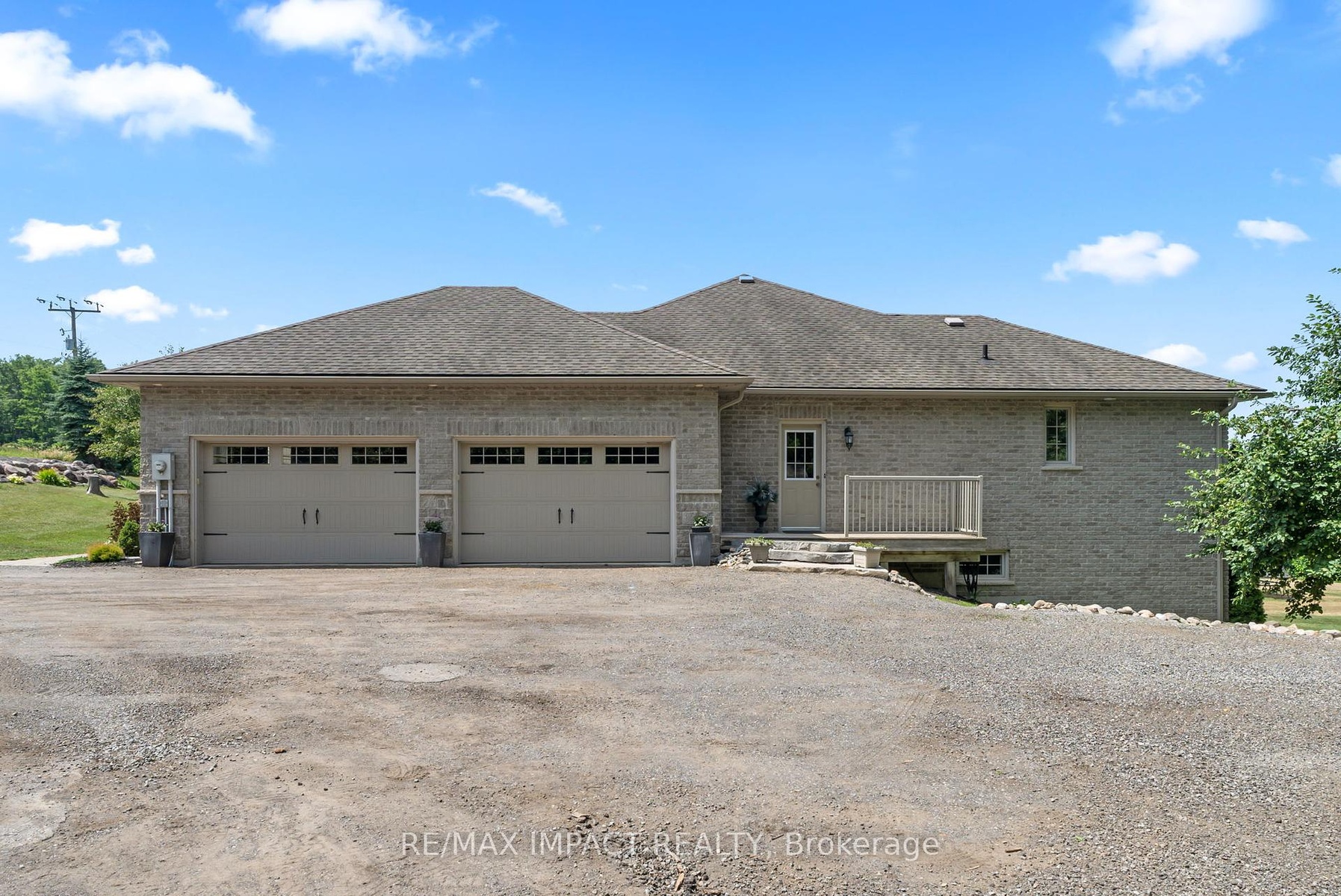 Impressive custom brick/stone bungalow, boasting over 2500 sf of luxurious living space on the main level plus full walkout basement and attached heated 3-car garage with 2 overhead doors. Nestled on an expansive 1.74 acres, this home offers a serene lifestyle with panoramic views overlooking farmlands and the Cavan Hills, complete with a spring-fed pond, ranging from 10-14 deep. As you enter the front foyer, there is a convenient den plus the grandeur of a spacious great room, accentuated by a striking stone fireplace and a unique waffle-patterned feature wall. Gleaming hardwood floors flow throughout the home with an abundance of crown mouldings and pot lights. The chefs kitchen is a culinary delight, equipped with stainless steel appliances, a granite countertop, ceramic backsplash, and an island with a veggie sink. The adjacent large dining area opens onto a generous deck, designed with tempered regal glass for unobstructed views of the backyard and fire pit area, ideal for entertaining friends and family. The main floor features 4 well-appointed bedrooms, including a primary suite that includes a walkout to the deck, a luxurious 5-pc ensuite with dual sinks, a separate shower and a whirlpool tub, all complemented by a stylish barn door privacy feature. The primary suite also boasts a walk-in closet with built-in shelving for optimal organization. Two of the additional bedrooms share a convenient Jack and Jill bathroom, while a third bedroom is situated near the 2-pc powder room. The walkout basement includes large above-grade windows that flood the space with natural light, a cozy family room complete with an electric infinity fireplace and a dry bar, 3-pc washroom and a huge open area with extra plumbing rough-ins, perfect for customization. The basement also features ample storage, making it an excellent option for a multi-generational living arrangement with its separate entrances and walkout basement.