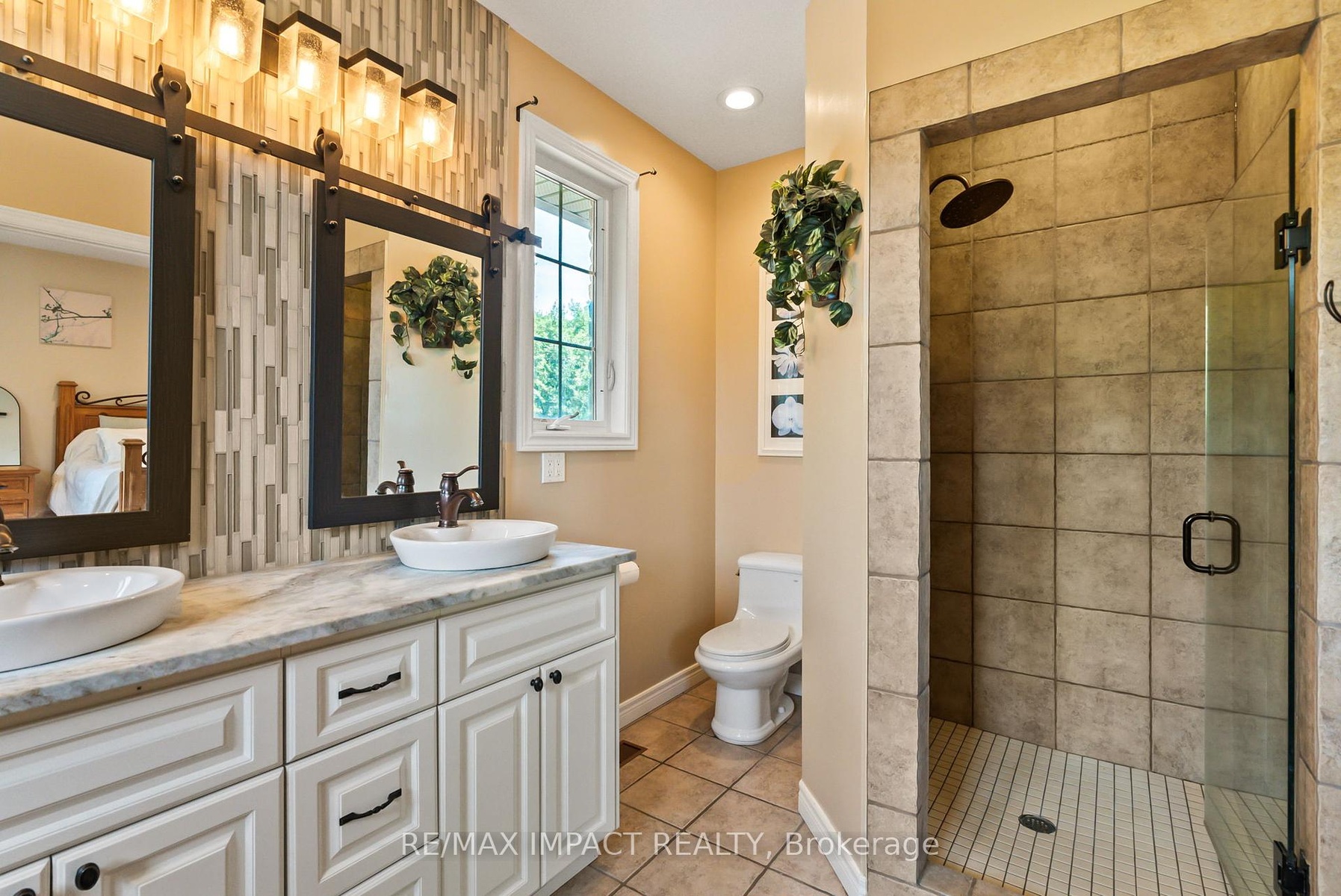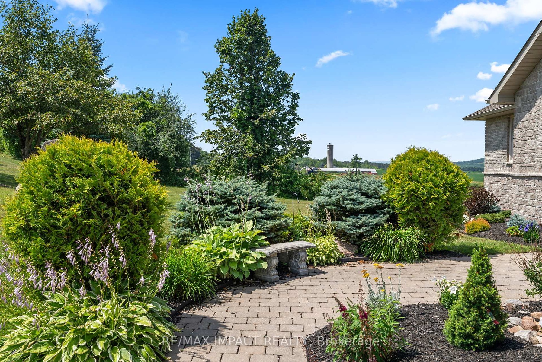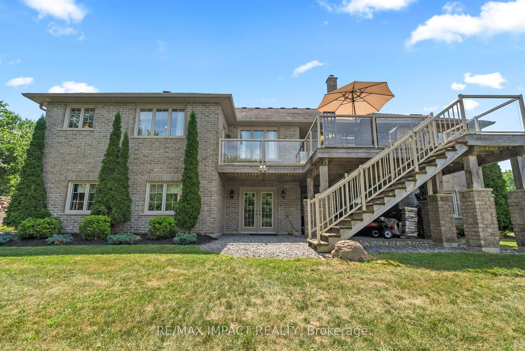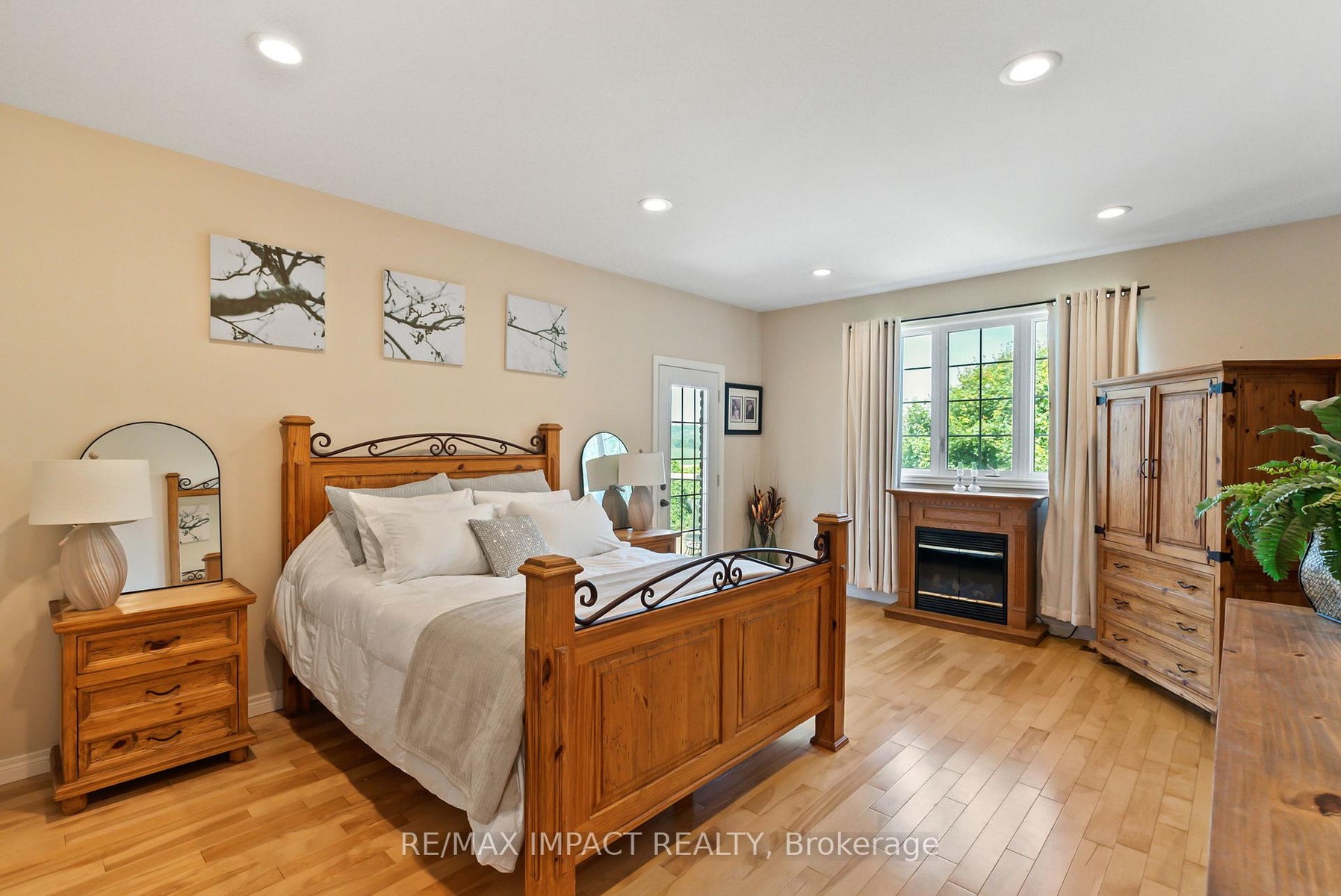 Impressive custom brick/stone bungalow, boasting over 2500 sf of luxurious living space on the main level plus full walkout basement and attached heated 3-car garage with 2 overhead doors. Nestled on an expansive 1.74 acres, this home offers a serene lifestyle with panoramic views overlooking farmlands and the Cavan Hills, complete with a spring-fed pond, ranging from 10-14 deep. As you enter the front foyer, there is a convenient den plus the grandeur of a spacious great room, accentuated by a striking stone fireplace and a unique waffle-patterned feature wall. Gleaming hardwood floors flow throughout the home with an abundance of crown mouldings and pot lights. The chefs kitchen is a culinary delight, equipped with stainless steel appliances, a granite countertop, ceramic backsplash, and an island with a veggie sink. The adjacent large dining area opens onto a generous deck, designed with tempered regal glass for unobstructed views of the backyard and fire pit area, ideal for entertaining friends and family. The main floor features 4 well-appointed bedrooms, including a primary suite that includes a walkout to the deck, a luxurious 5-pc ensuite with dual sinks, a separate shower and a whirlpool tub, all complemented by a stylish barn door privacy feature. The primary suite also boasts a walk-in closet with built-in shelving for optimal organization. Two of the additional bedrooms share a convenient Jack and Jill bathroom, while a third bedroom is situated near the 2-pc powder room. The walkout basement includes large above-grade windows that flood the space with natural light, a cozy family room complete with an electric infinity fireplace and a dry bar, 3-pc washroom and a huge open area with extra plumbing rough-ins, perfect for customization. The basement also features ample storage, making it an excellent option for a multi-generational living arrangement with its separate entrances and walkout basement.