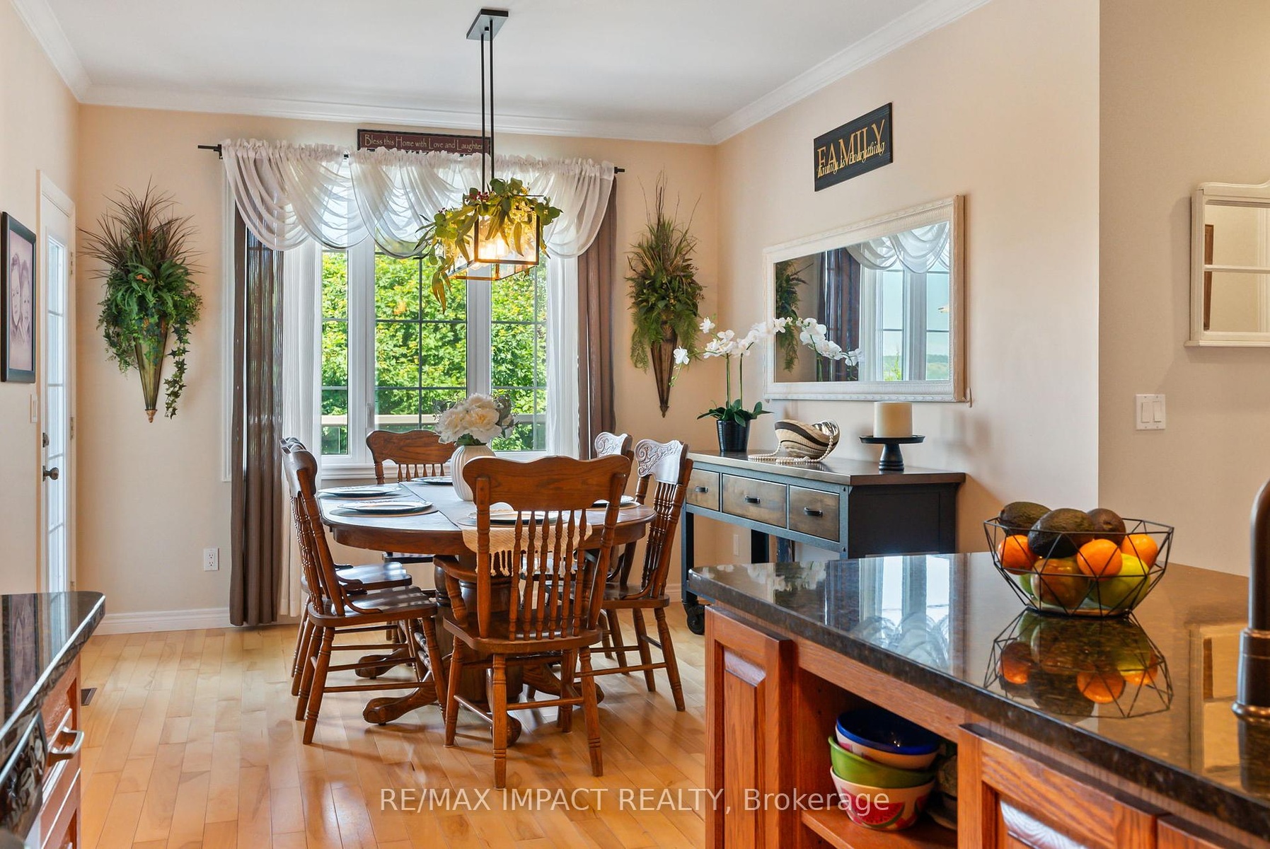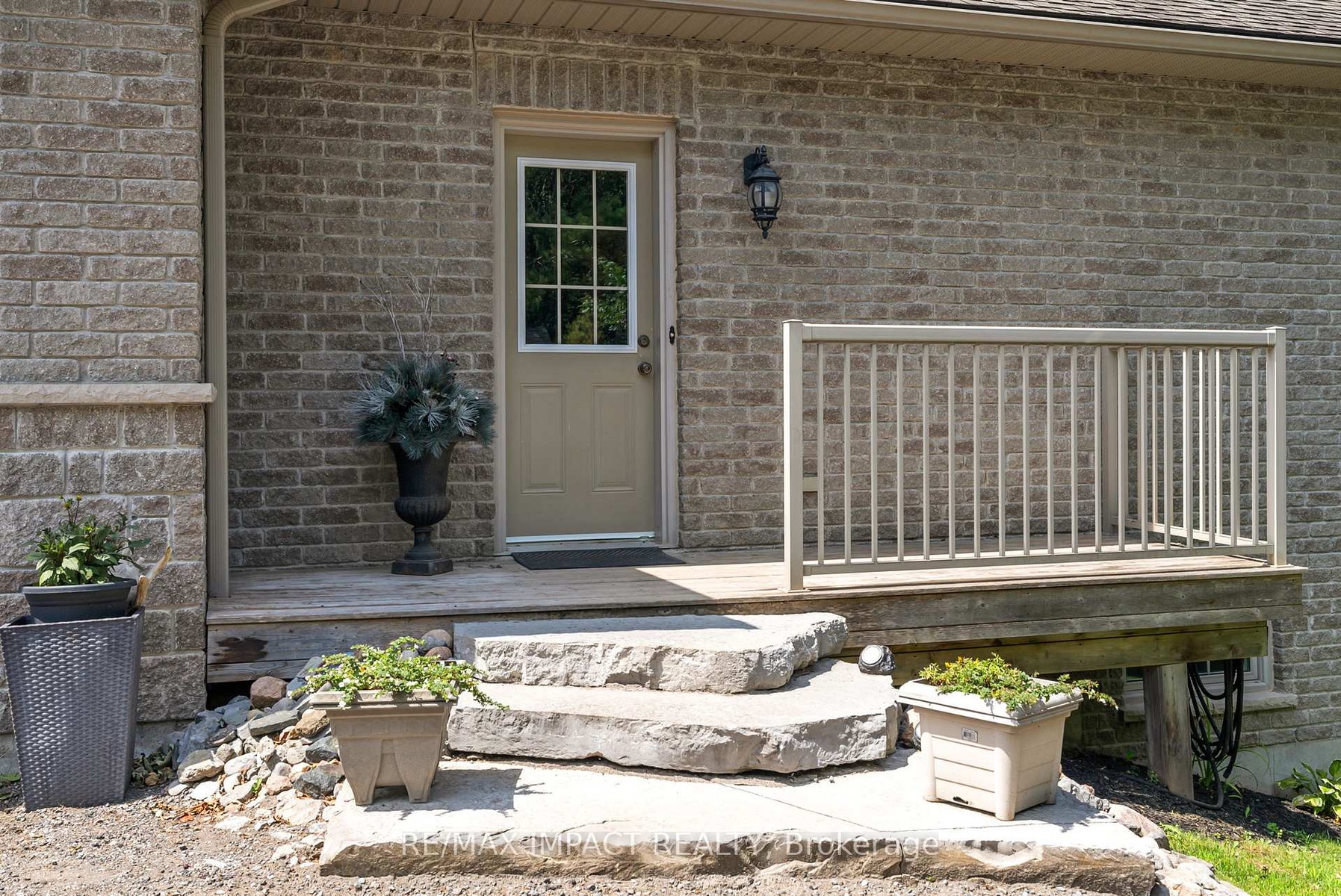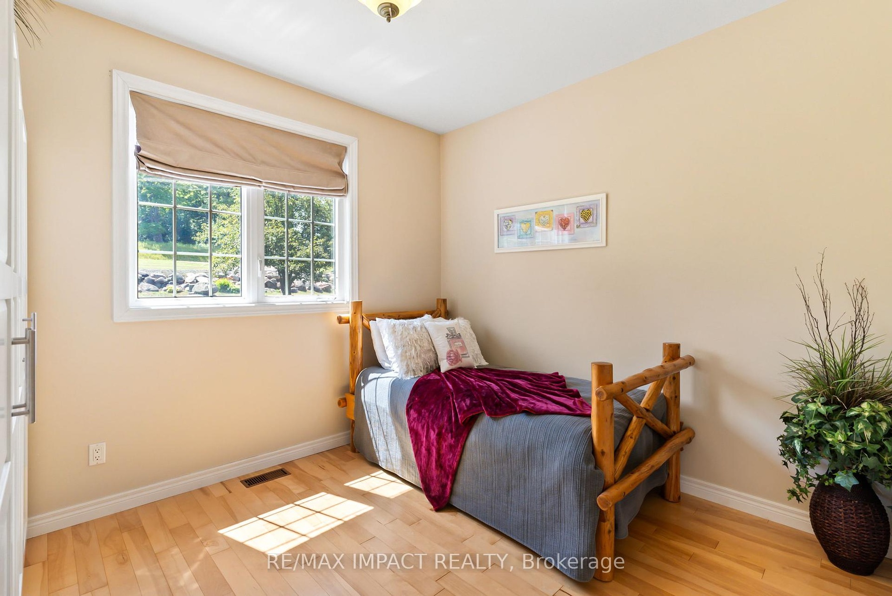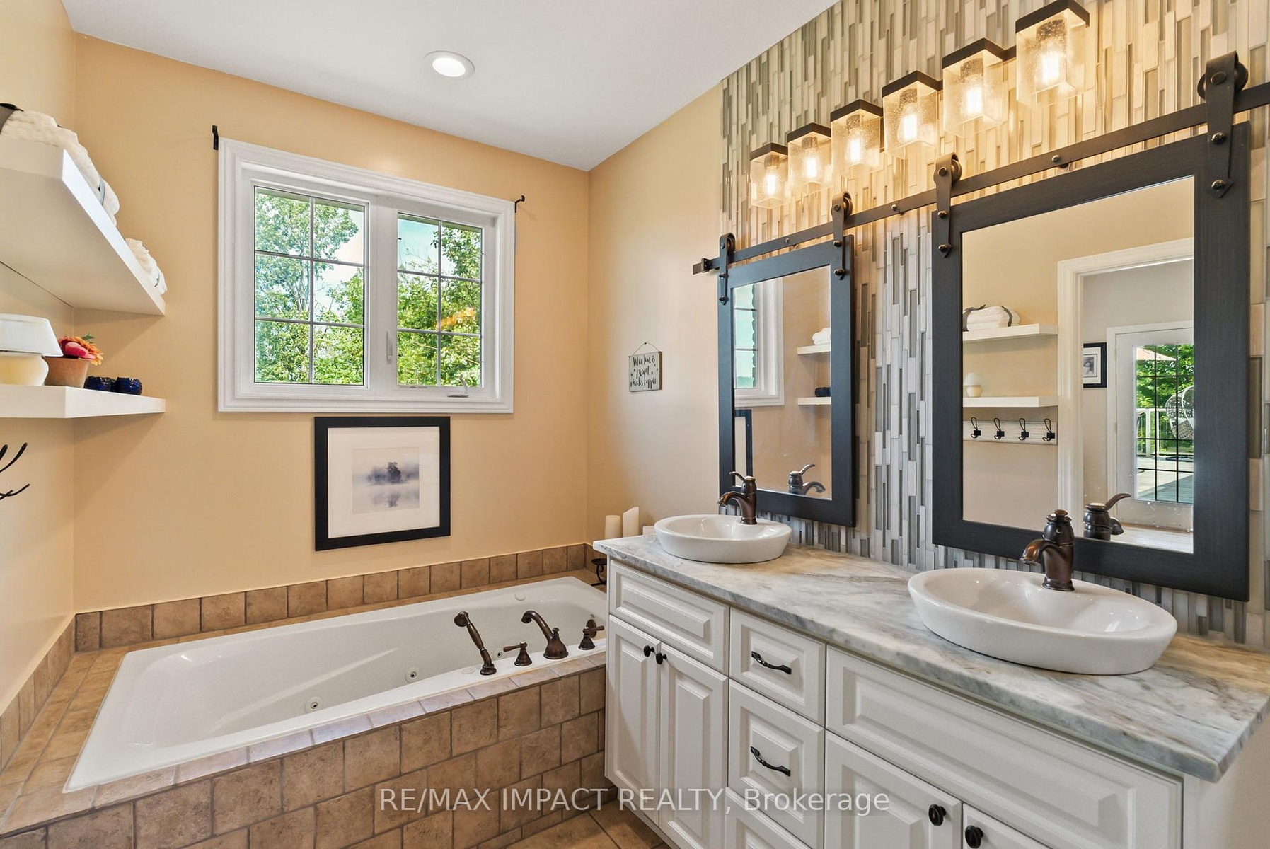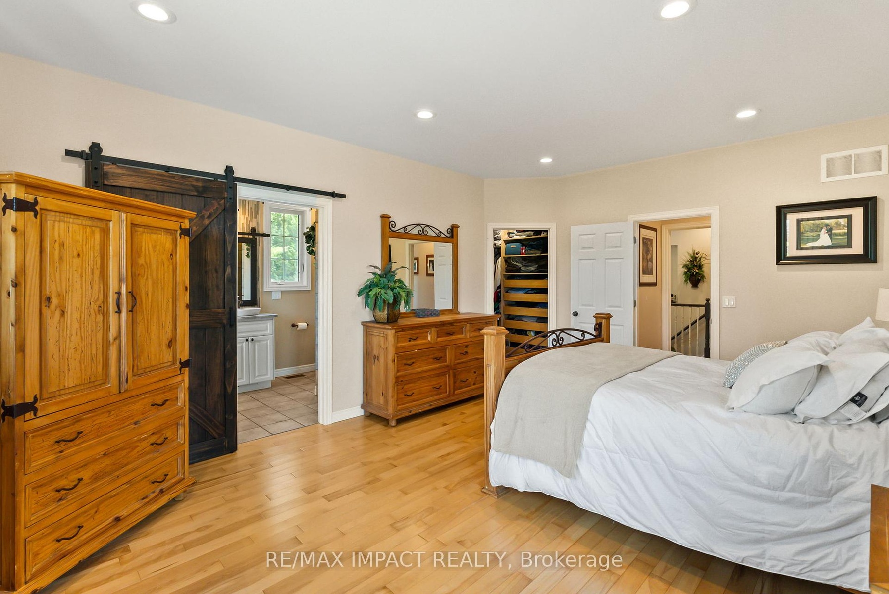 Impressive custom brick/stone bungalow, boasting over 2500 sf of luxurious living space on the main level plus full walkout basement and attached heated 3-car garage with 2 overhead doors. Nestled on an expansive 1.74 acres, this home offers a serene lifestyle with panoramic views overlooking farmlands and the Cavan Hills, complete with a spring-fed pond, ranging from 10-14 deep. As you enter the front foyer, there is a convenient den plus the grandeur of a spacious great room, accentuated by a striking stone fireplace and a unique waffle-patterned feature wall. Gleaming hardwood floors flow throughout the home with an abundance of crown mouldings and pot lights. The chefs kitchen is a culinary delight, equipped with stainless steel appliances, a granite countertop, ceramic backsplash, and an island with a veggie sink. The adjacent large dining area opens onto a generous deck, designed with tempered regal glass for unobstructed views of the backyard and fire pit area, ideal for entertaining friends and family. The main floor features 4 well-appointed bedrooms, including a primary suite that includes a walkout to the deck, a luxurious 5-pc ensuite with dual sinks, a separate shower and a whirlpool tub, all complemented by a stylish barn door privacy feature. The primary suite also boasts a walk-in closet with built-in shelving for optimal organization. Two of the additional bedrooms share a convenient Jack and Jill bathroom, while a third bedroom is situated near the 2-pc powder room. The walkout basement includes large above-grade windows that flood the space with natural light, a cozy family room complete with an electric infinity fireplace and a dry bar, 3-pc washroom and a huge open area with extra plumbing rough-ins, perfect for customization. The basement also features ample storage, making it an excellent option for a multi-generational living arrangement with its separate entrances and walkout basement.