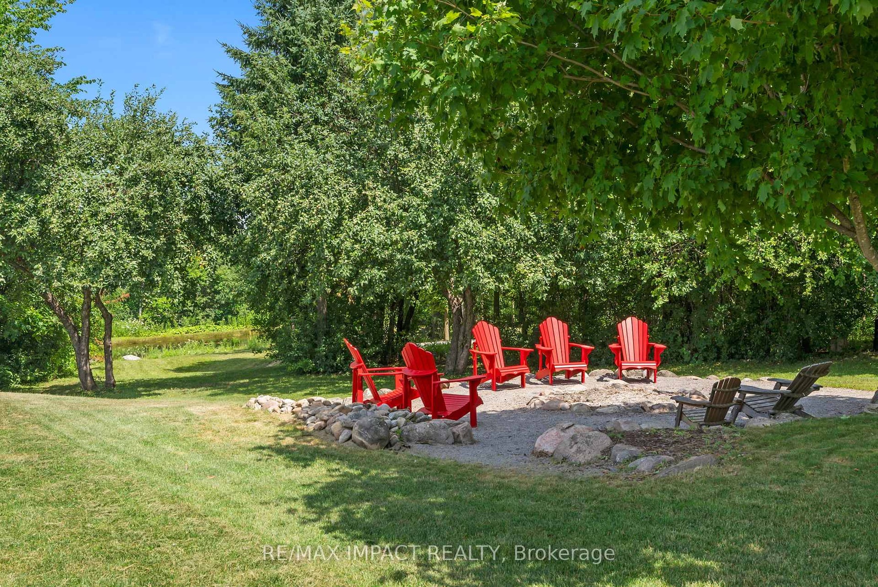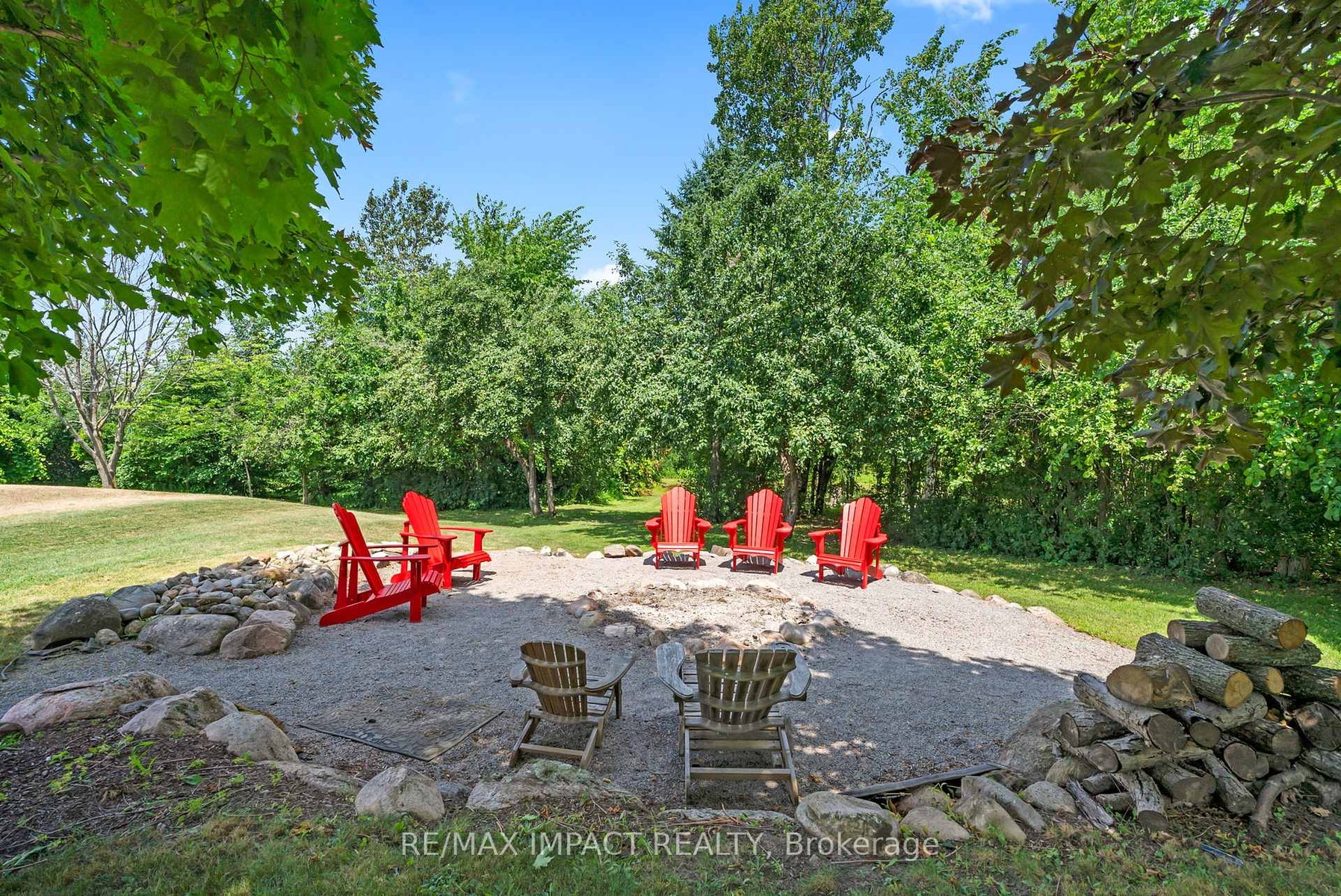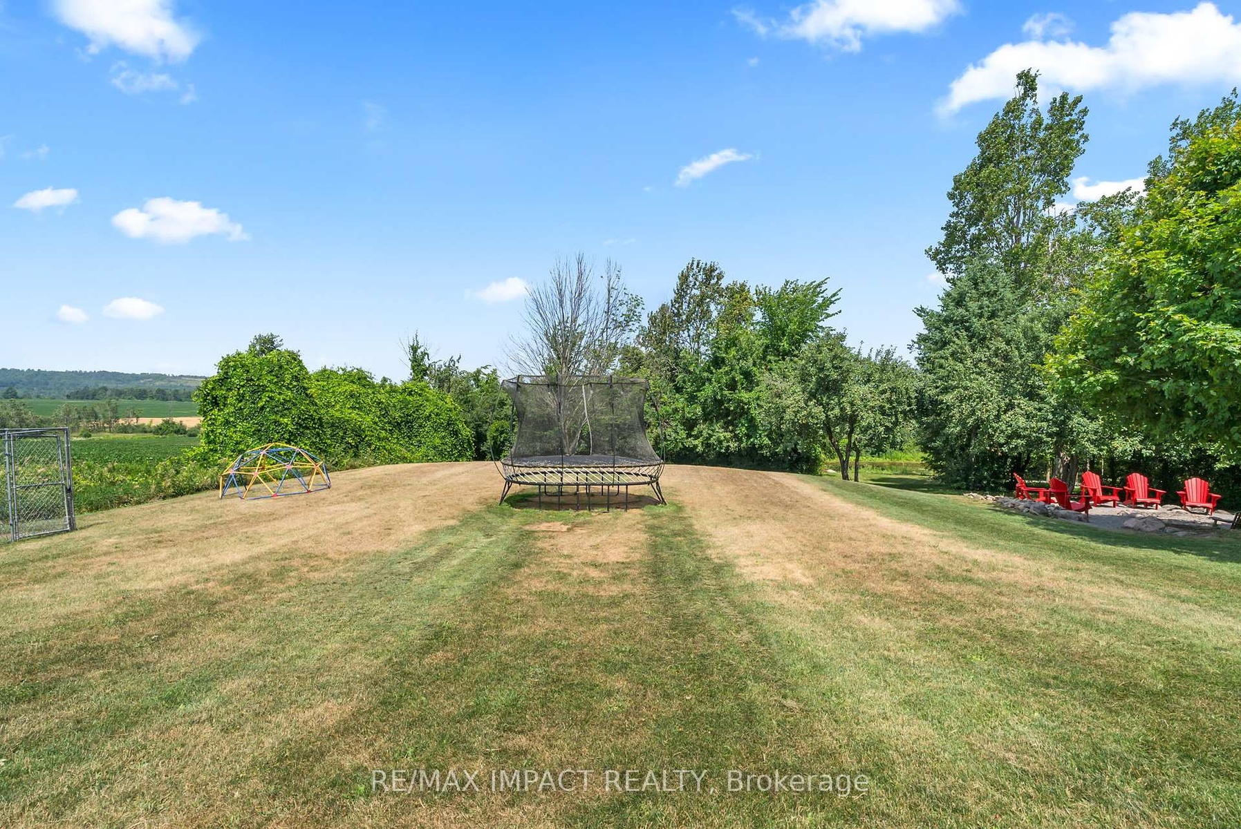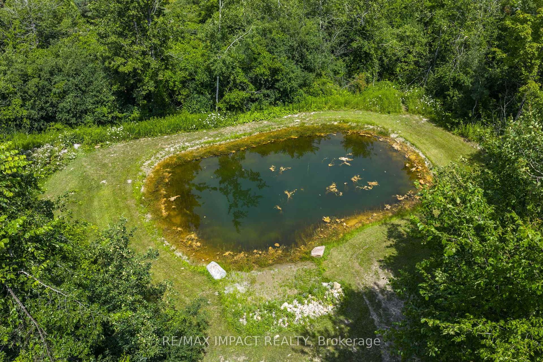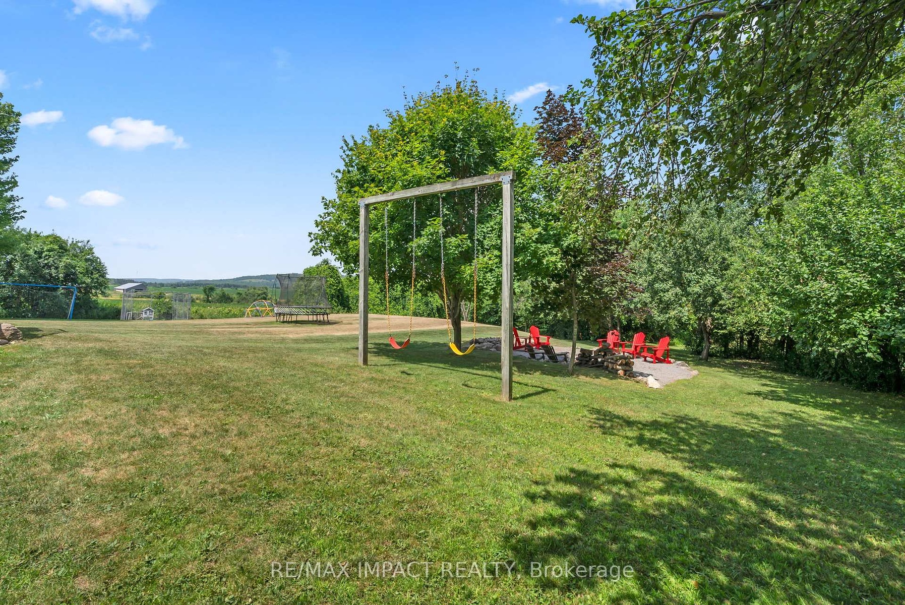Impressive custom brick/stone bungalow, boasting over 2500 sf of luxurious living space on the main level plus full walkout basement and attached heated 3-car garage with 2 overhead doors. Nestled on an expansive 1.74 acres, this home offers a serene lifestyle with panoramic views overlooking farmlands and the Cavan Hills, complete with a spring-fed pond, ranging from 10-14 deep. As you enter the front foyer, there is a convenient den plus the grandeur of a spacious great room, accentuated by a striking stone fireplace and a unique waffle-patterned feature wall. Gleaming hardwood floors flow throughout the home with an abundance of crown mouldings and pot lights. The chefs kitchen is a culinary delight, equipped with stainless steel appliances, a granite countertop, ceramic backsplash, and an island with a veggie sink. The adjacent large dining area opens onto a generous deck, designed with tempered regal glass for unobstructed views of the backyard and fire pit area, ideal for entertaining friends and family. The main floor features 4 well-appointed bedrooms, including a primary suite that includes a walkout to the deck, a luxurious 5-pc ensuite with dual sinks, a separate shower and a whirlpool tub, all complemented by a stylish barn door privacy feature. The primary suite also boasts a walk-in closet with built-in shelving for optimal organization. Two of the additional bedrooms share a convenient Jack and Jill bathroom, while a third bedroom is situated near the 2-pc powder room. The walkout basement includes large above-grade windows that flood the space with natural light, a cozy family room complete with an electric infinity fireplace and a dry bar, 3-pc washroom and a huge open area with extra plumbing rough-ins, perfect for customization. The basement also features ample storage, making it an excellent option for a multi-generational living arrangement with its separate entrances and walkout basement.