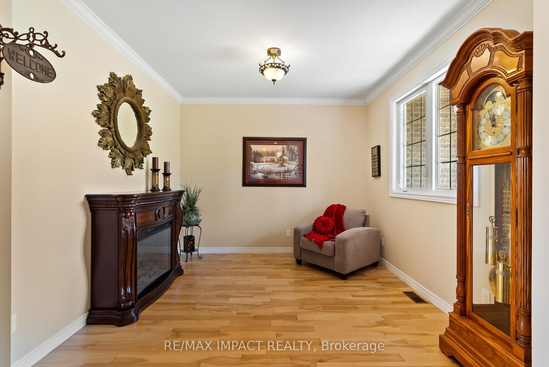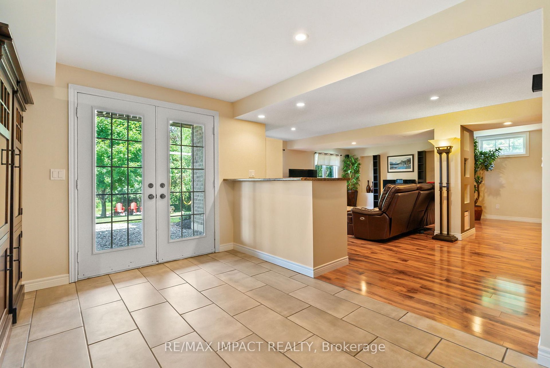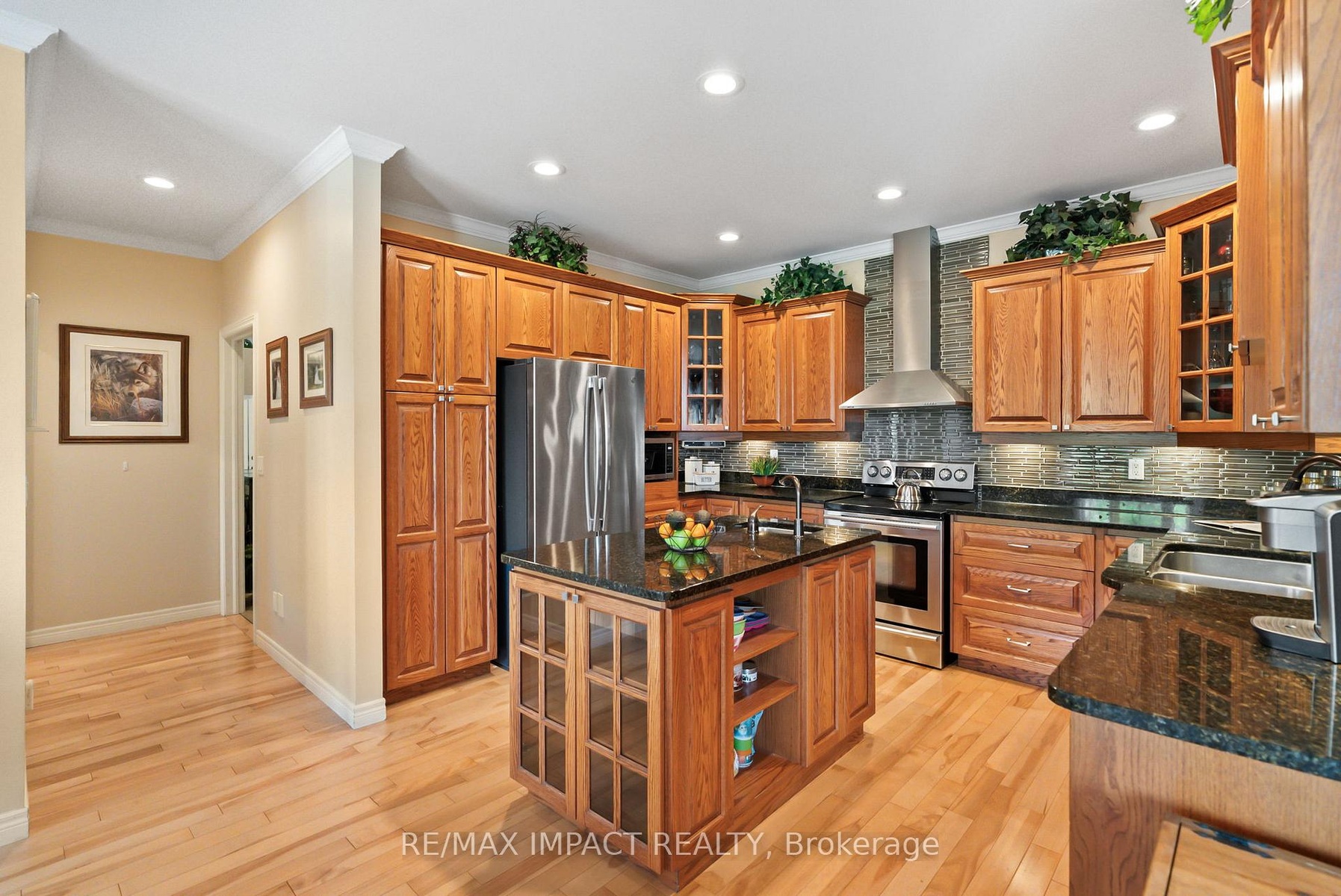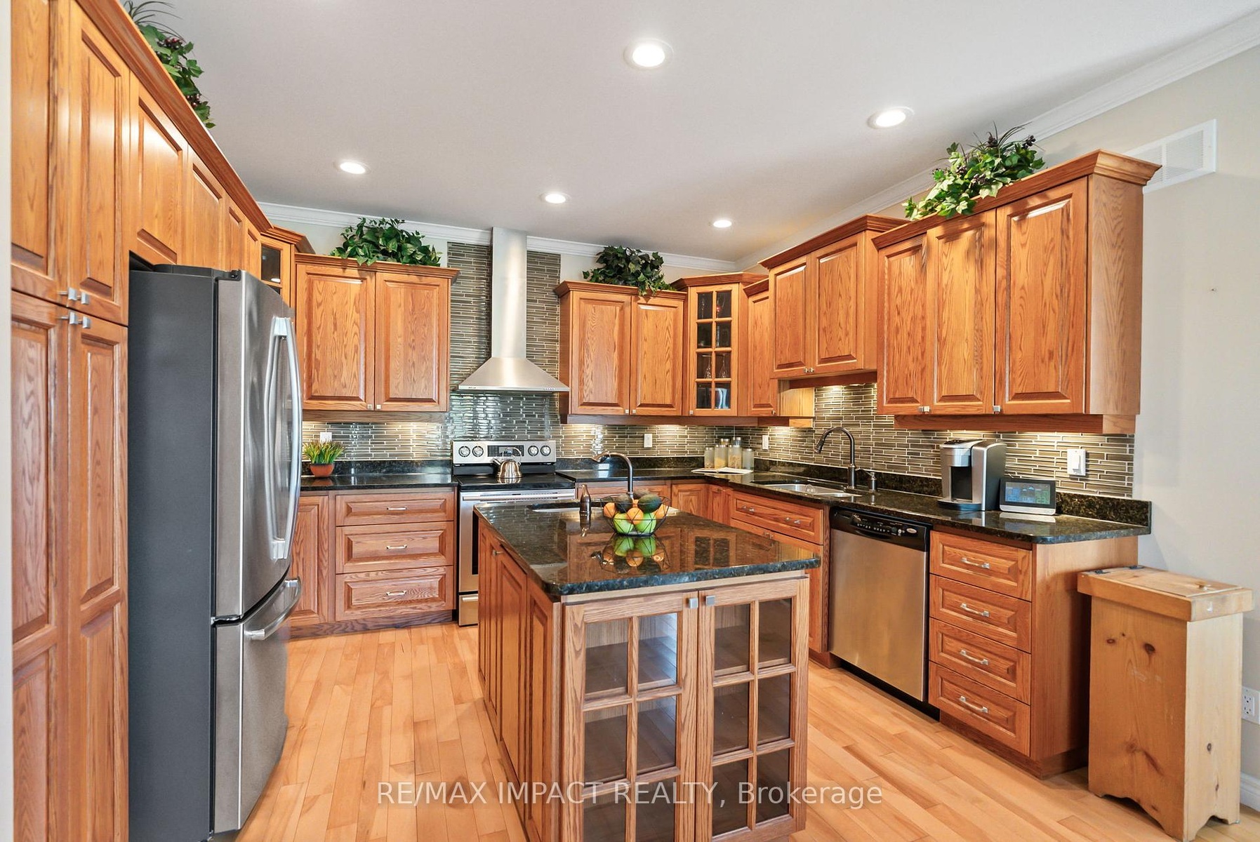 DescriptionImpressive custom brick/stone bungalow, boasting over 2500 sf of luxurious living space on the main level plus full walkout basement and attached heated 3-car garage with 2 overhead doors. Nestled on an expansive 1.74 acres, this home offers a serene lifestyle with panoramic views overlooking farmlands and the Cavan Hills, complete with a spring-fed pond, ranging from 10-14 deep. As you enter the front foyer, there is a convenient den plus the grandeur of a spacious great room, accentuated by a striking stone fireplace and a unique waffle-patterned feature wall. Gleaming hardwood floors flow throughout the home with an abundance of crown mouldings and pot lights. The chefs kitchen is a culinary delight, equipped with stainless steel appliances, a granite countertop, ceramic backsplash, and an island with a veggie sink. The adjacent large dining area opens onto a generous deck, designed with tempered regal glass for unobstructed views of the backyard and fire pit area, ideal for entertaining friends and family. The main floor features 4 well-appointed bedrooms, including a primary suite that includes a walkout to the deck, a luxurious 5-pc ensuite with dual sinks, a separate shower and a whirlpool tub, all complemented by a stylish barn door privacy feature. The primary suite also boasts a walk-in closet with built-in shelving for optimal organization. Two of the additional bedrooms share a convenient Jack and Jill bathroom, while a third bedroom is situated near the 2-pc powder room. The walkout basement includes large above-grade windows that flood the space with natural light, a cozy family room complete with an electric infinity fireplace and a dry bar, 3-pc washroom and a huge open area with extra plumbing rough-ins, perfect for customization. The basement also features ample storage, making it an excellent option for a multi-generational living arrangement with its separate entrances and walkout basement.Amenities- Air Exchanger