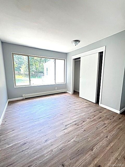 - Unfurnished bedroom featuring wood finished floors, baseboard heating, and a closet