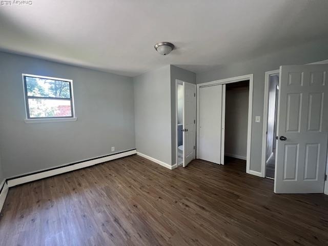 - Unfurnished bedroom with dark wood finished floors, a closet, and a baseboard radiator