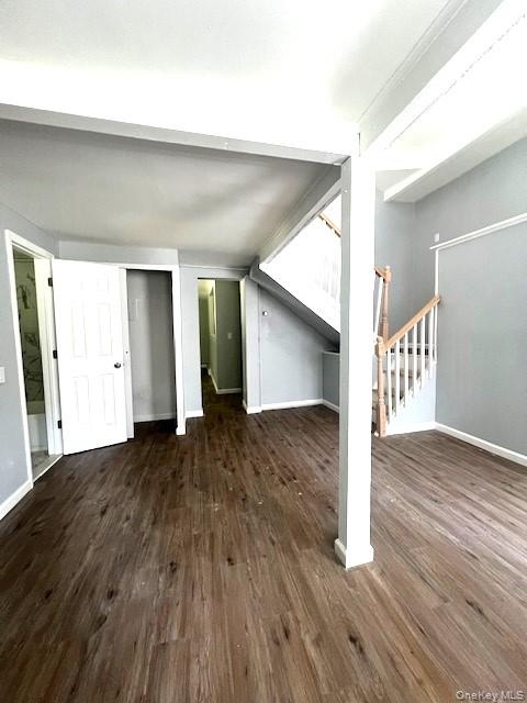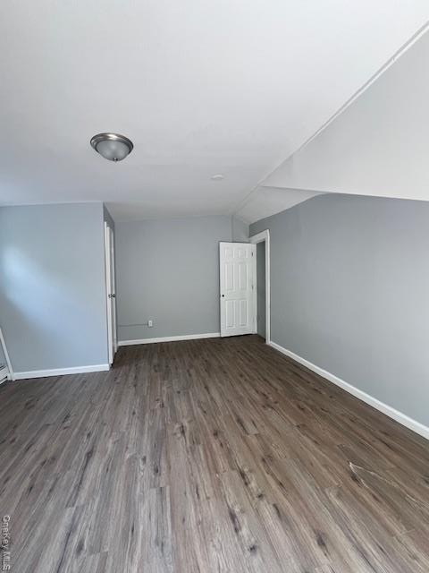 - Unfurnished room with dark wood-type flooring and vaulted ceiling