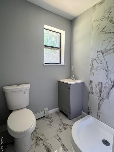 - Bathroom featuring marble finish floors, vanity, plenty of natural light, and a baseboard radiator