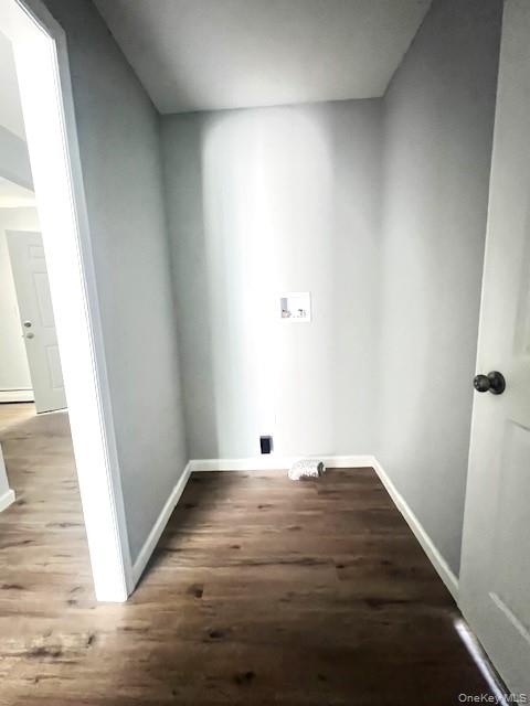- Empty room featuring a baseboard radiator and dark wood-type flooring