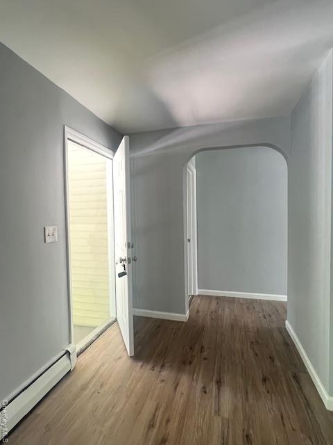 - Unfurnished room featuring arched walkways, a baseboard heating unit, and wood finished floors