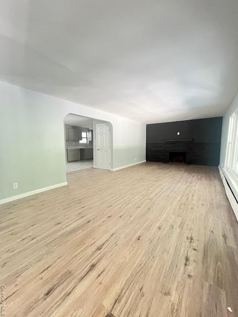 - Unfurnished living room featuring light wood-style floors, arched walkways, and a baseboard radiator