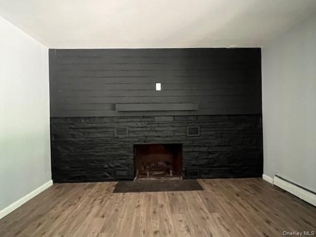- Unfurnished living room featuring wood finished floors, a fireplace, and a baseboard heating unit