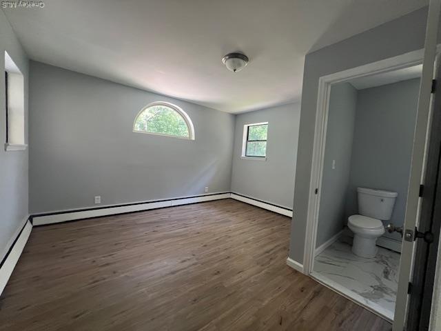 - Unfurnished bedroom featuring baseboard heating, wood finished floors, and a closet