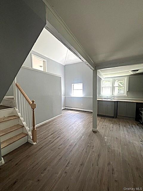 - Summer kitchen and dining area featuring wood finished floors, stairway, vaulted ceiling, and a baseboard radiator, cabinets