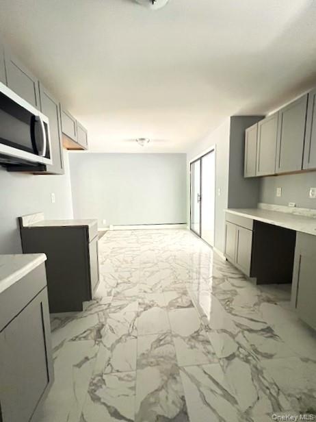 - Kitchen with light marble finish flooring, gray cabinetry, stainless steel microwave, and light countertops