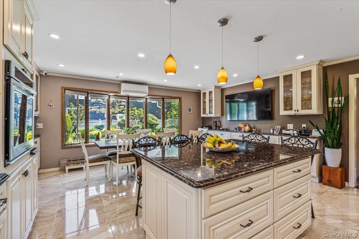 - Kitchen with a wall mounted AC, stainless steel oven, cream cabinets, crown molding, and light marble finish floors