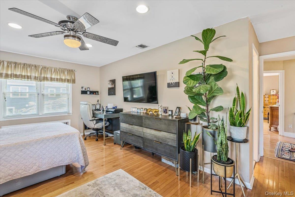 - Bedroom featuring wood-type flooring, a ceiling fan, and recessed lighting
