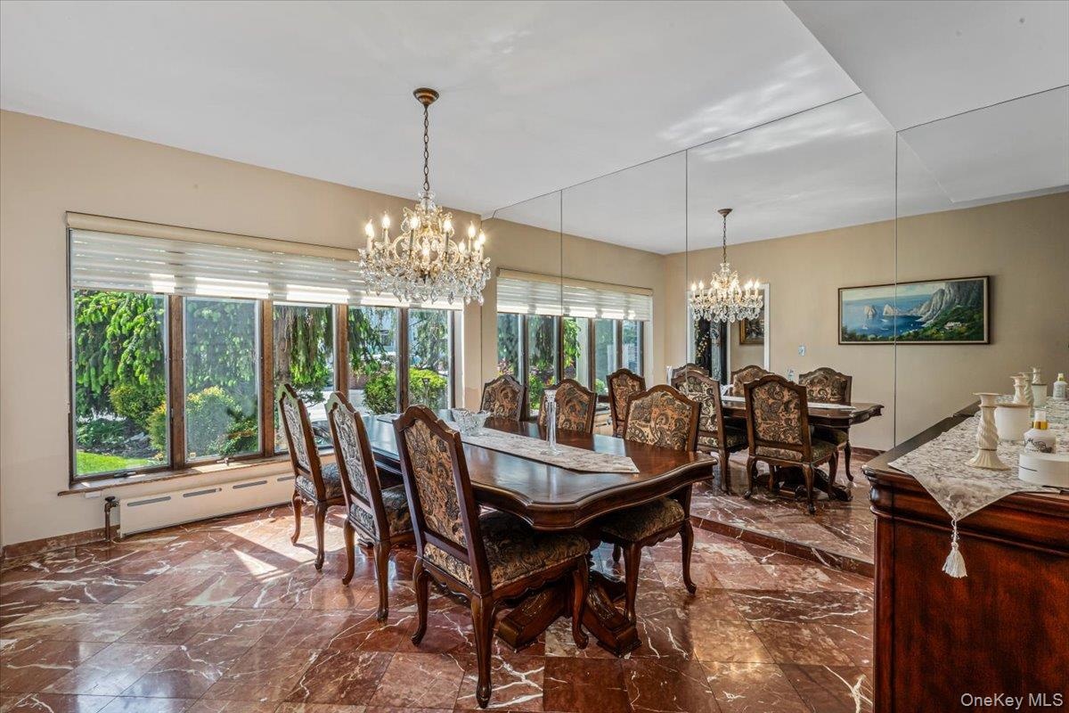- Dining room with a chandelier, baseboard heating, and dark marble finish floors