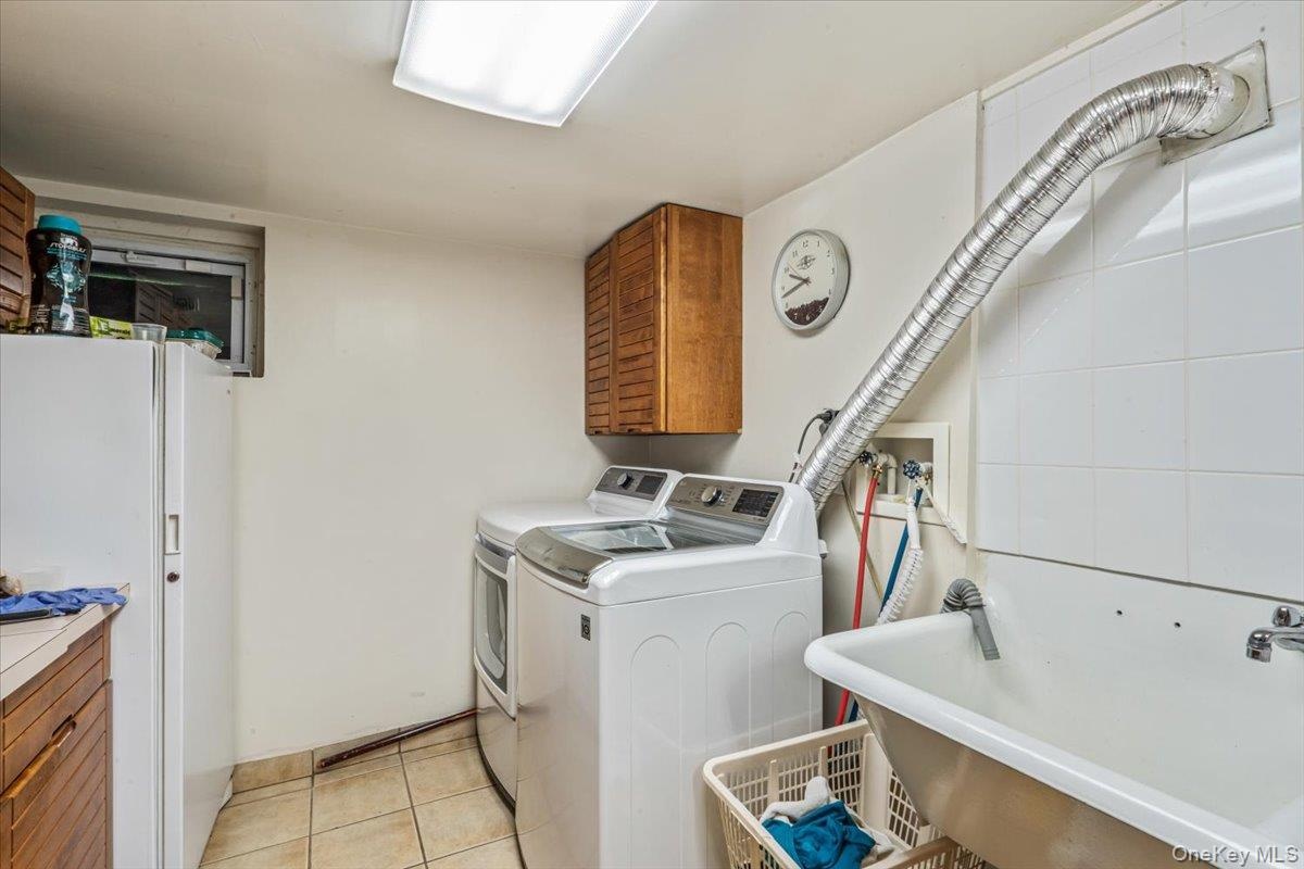 - Washroom featuring cabinet space, separate washer and dryer, and light tile patterned floors