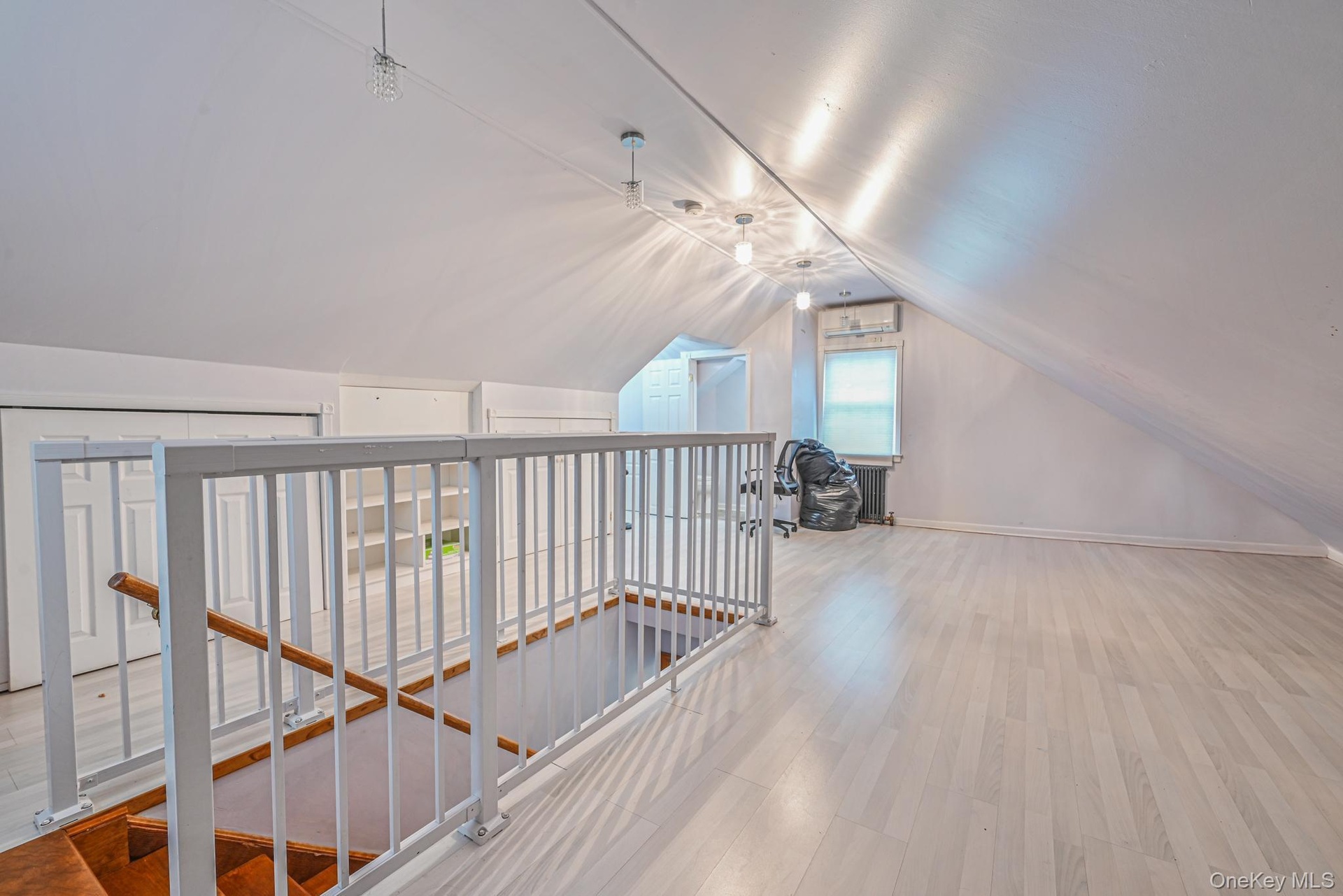 - Additional living space featuring wood finished floors, lofted ceiling, and radiator heating unit