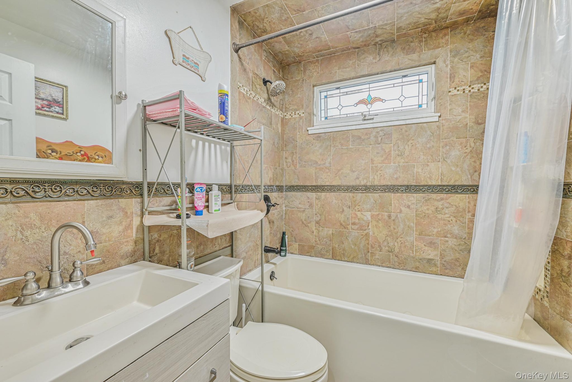 - Bathroom with shower / bathtub combination with curtain, vanity, and tile walls