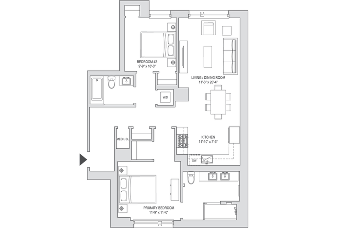 Encompassing 1,117 SF, Residence 11E is a unique 2-bedroom, 2-bath home with an appealing open layout and 10' ceilings. This gracious split-bedroom home features oversized windows and 5" white oak floors.