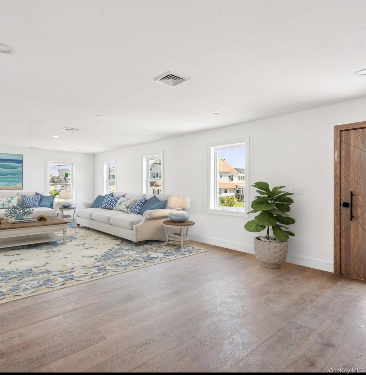 - Unfurnished living room with healthy amount of natural light, wood finished floors, and recessed lighting