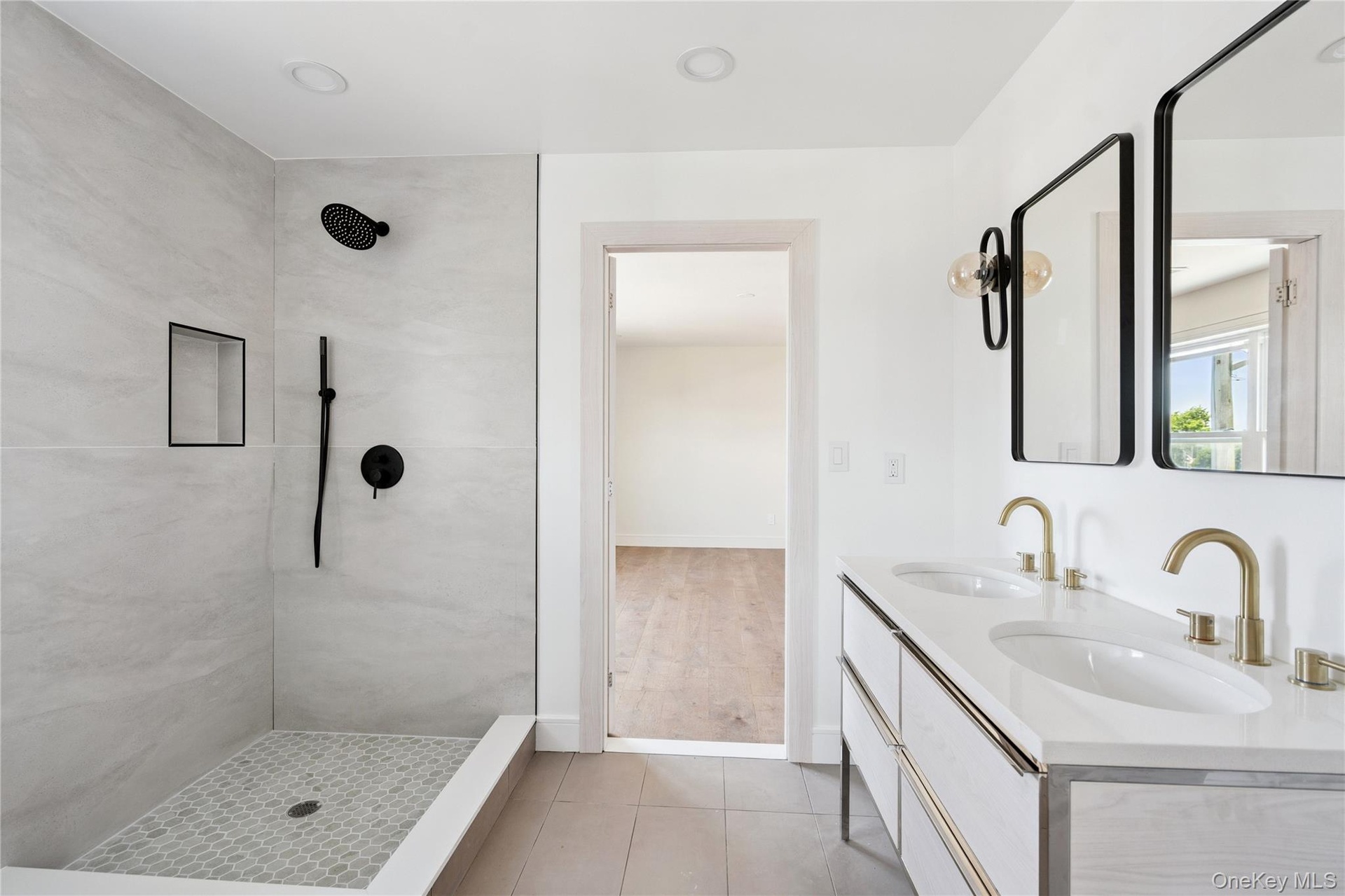 - Full bath with tiled shower, double vanity, tile patterned floors, and recessed lighting