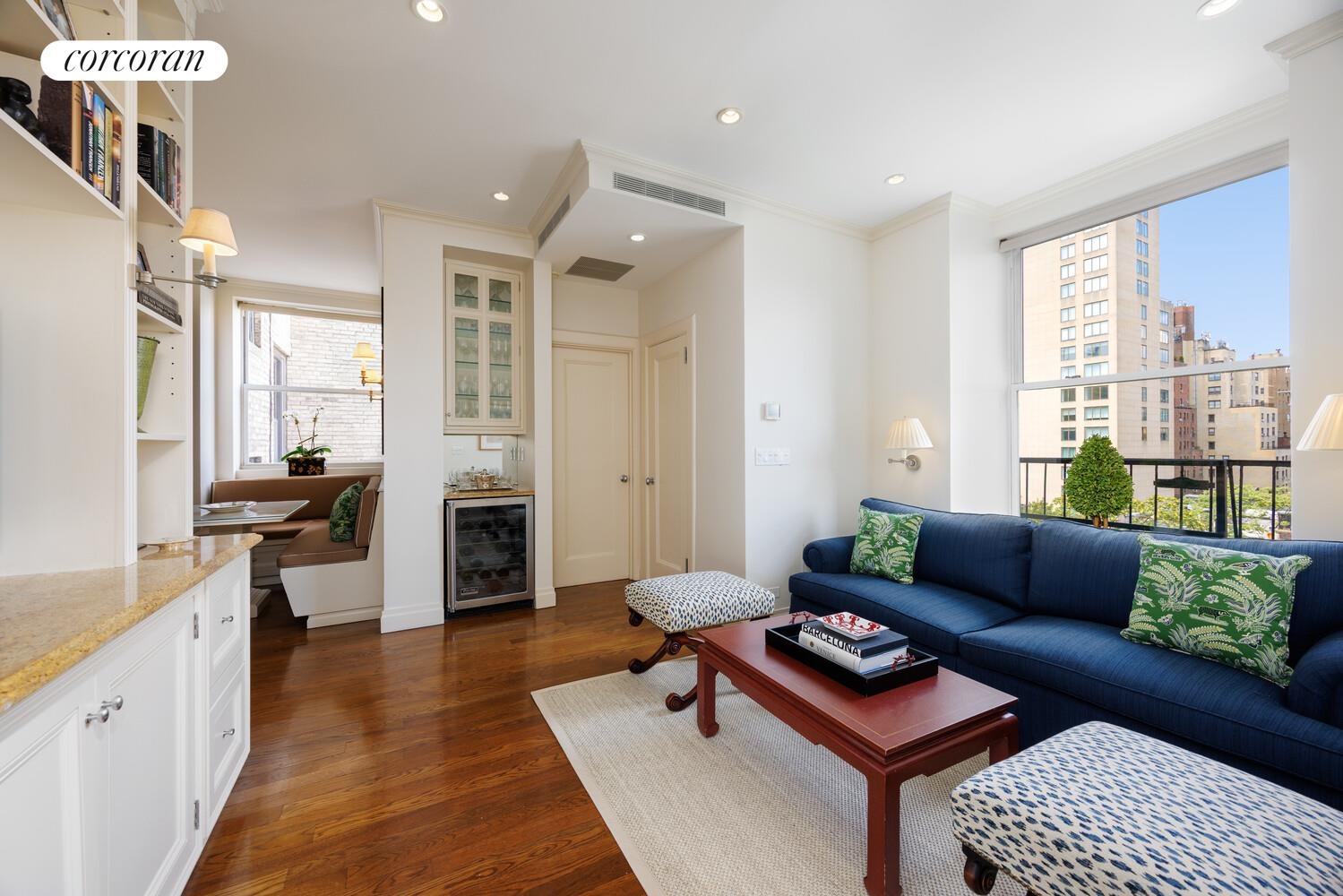 The grand living room, anchored by a wood-burning fireplace, is ideal for refined entertaining or quiet evenings at home. A richly appointed library with custom lacquered millwork and walls provides a tranquil space for reading or working, while the formal dining room-an impressive corner room with four oversized windows-overlooks tree-lined 81st Street townhouses and the Metropolitan Museum of Art, creating the perfect backdrop for unforgettable gatherings.
