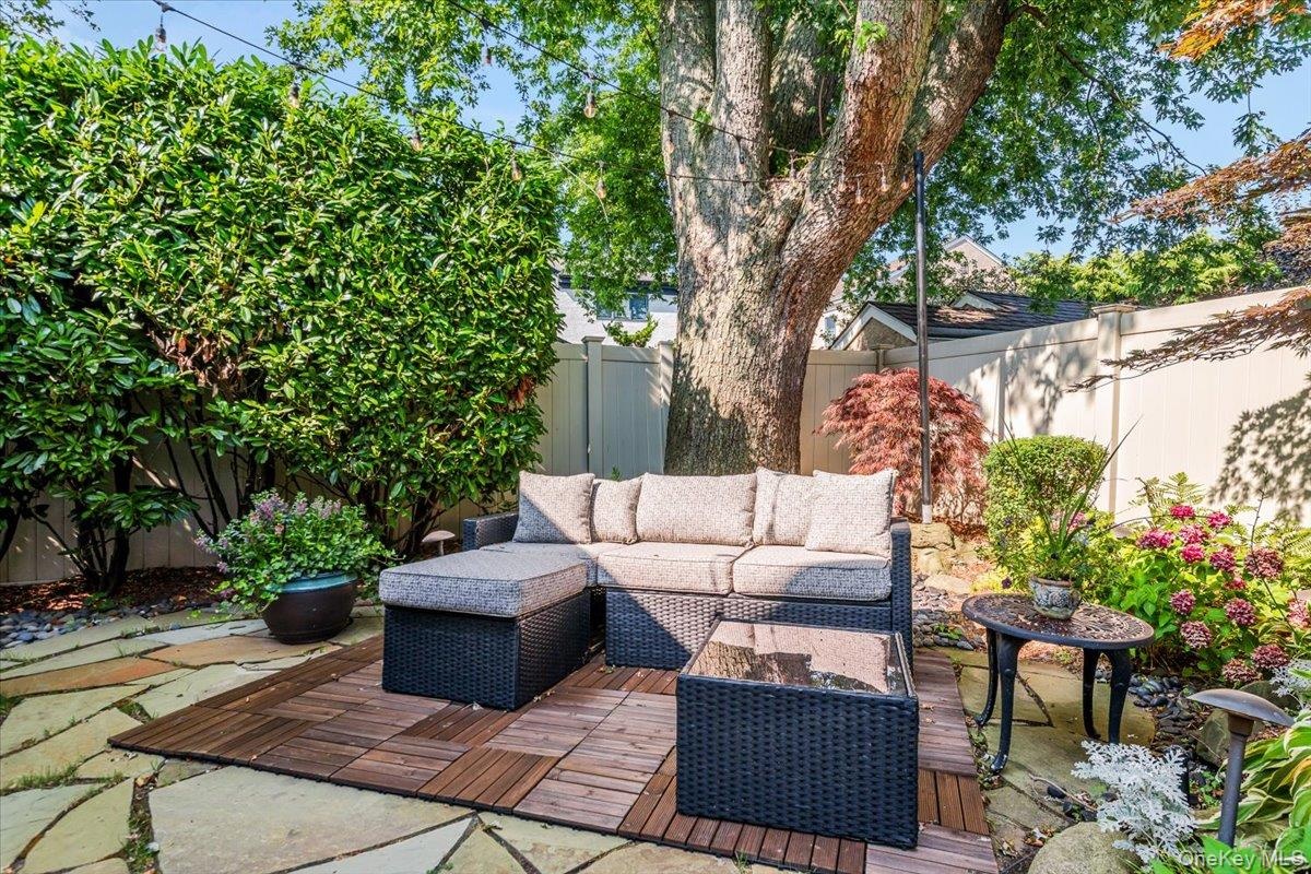 - Fenced backyard with outdoor lounge area and a deck