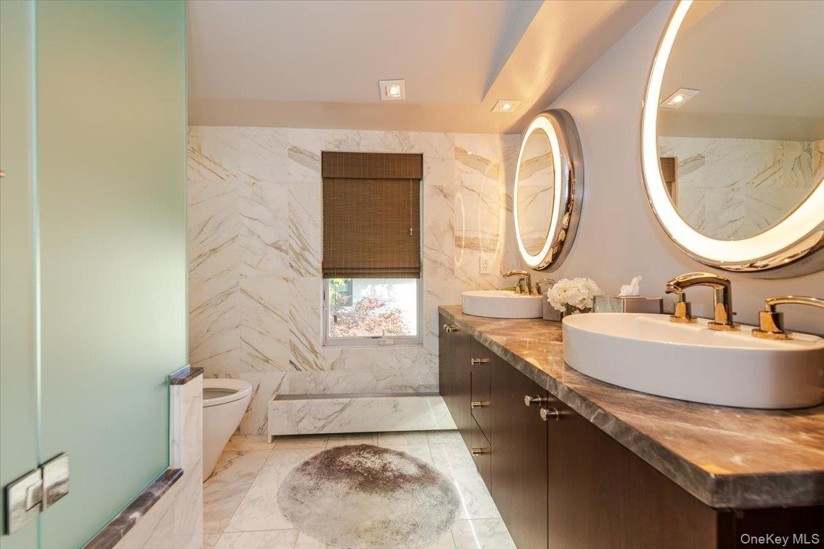 - Bathroom with double vanity and marble finish flooring