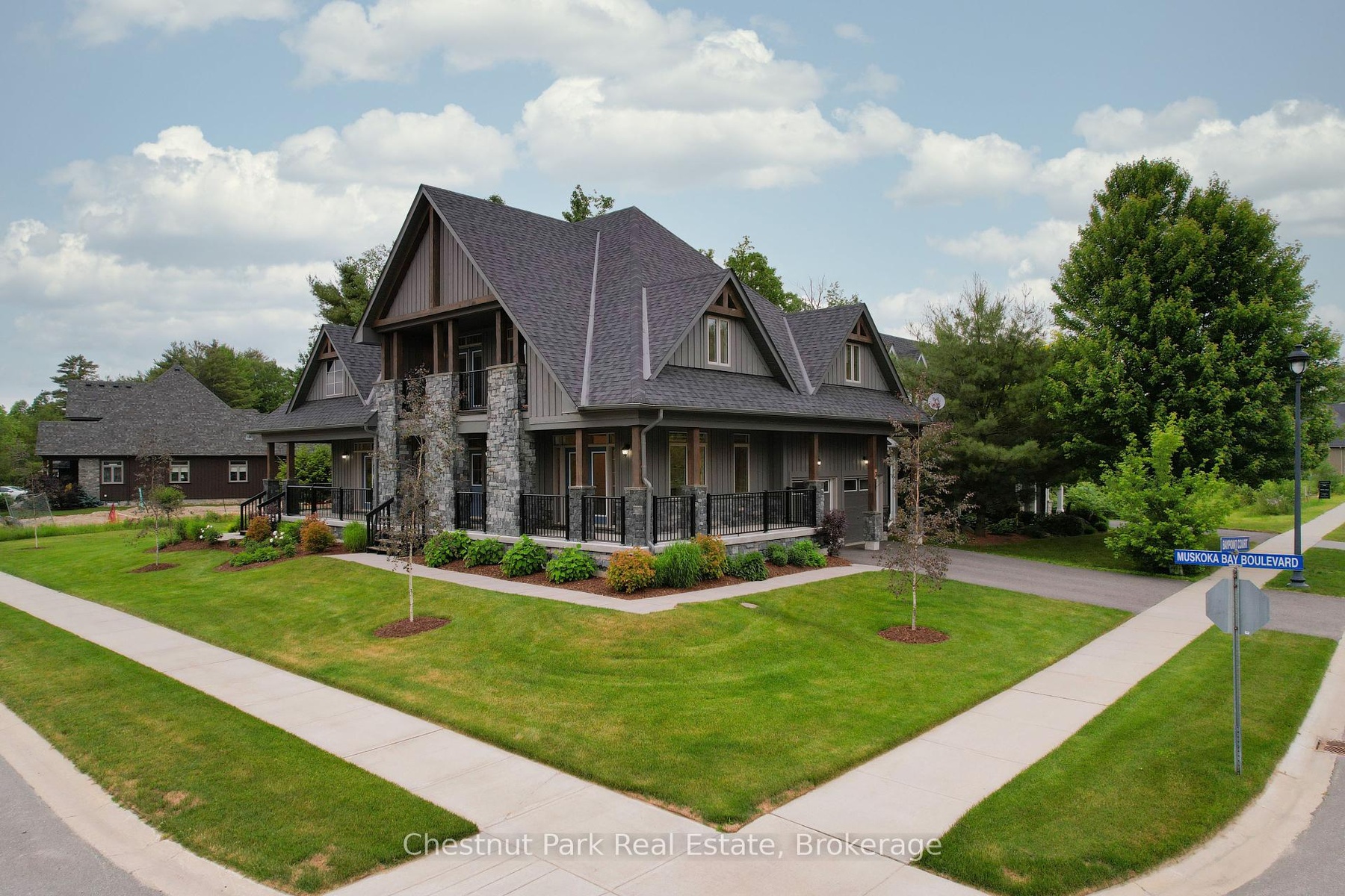 Welcome to 3 Baypoint Court, a family-friendly home nestled in the picturesque Muskoka Bay Community on a quiet cul-de-sac.This 3-bedroom, 3-bathroom residence beautifully blends modern elegance and timeless charm. The exterior features high-quality siding, striking stone accents, and energy-efficient windows that ensure comfort and sustainability. The wrap-around covered porch offers a perfect outdoor space to enjoy the serene surroundings. Inside, the home there is 2,784 sq. ft. of living space, highlighted by a gas fireplace in the living room, creating a cozy center piece. The upgraded kitchen features tall, custom cabinets offering ample storage and functionality, complemented by a large island and granite countertops. The full dining space leads both to the exterior covered porch and to the family room centered around the second gas fireplace. Retreat outdoors to the sundeck to relax into the evening. Central to the home, convenience is enhanced with a main floor laundry room with garage access. The primary bedroom on this level, serves as a peaceful retreat, with a 4-piece ensuite bath, perfect for unwinding after a busy day. A second bedroom and 4 PC bath complete the main floor living areas. Throughout the interior, upgraded pre-finished oak hardwood flooring is found in the living and dining areas, while ceramic tiles flow through the remainder. Soaring 9-foot ceilings on the main floor create an airy, spacious atmosphere. Additionally, 8ft. Ceilings are notable in the upstairs loft - overlooking the main living space. Step out from the loft to the balcony overlooking the neighbourhood below. Both the 3rd bedroom and third 4pc bath complete the second level. Below, the full unfinished basement offers potential for future living space. Complete with an attached double car garage, this family-oriented home is ideal for those seeking a vibrant community that emphasizes outdoor fun, relaxation, and a high quality of life.