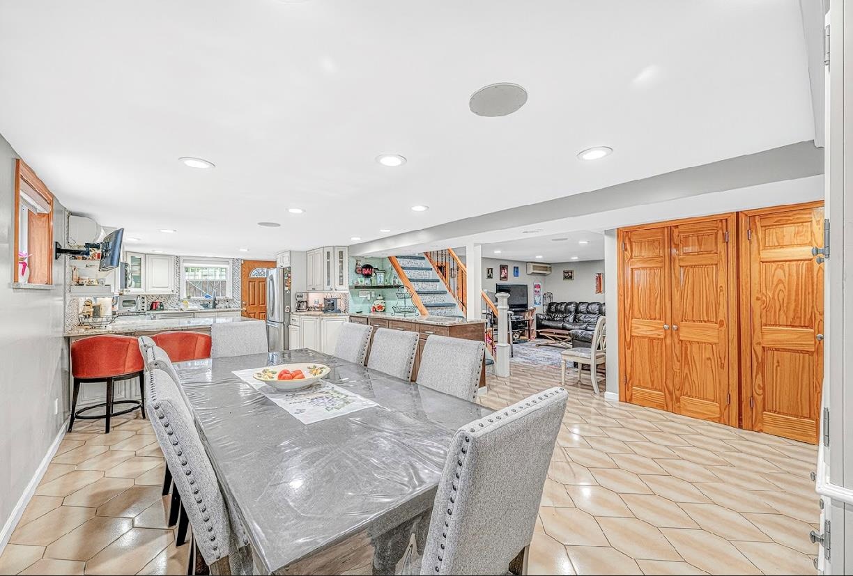 - Dining area with stairway, recessed lighting, and light tile patterned floors