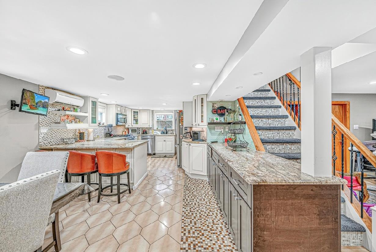 - Kitchen with a peninsula, appliances with stainless steel finishes, a kitchen bar, light stone counters, and recessed lighting