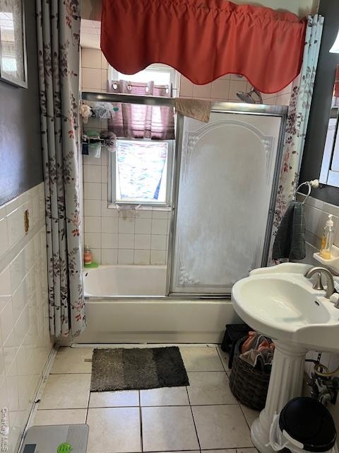 - Full bath featuring tile walls, tile patterned floors, and enclosed tub / shower combo