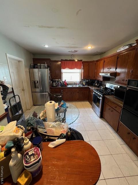 - Kitchen featuring dark countertops, refrigerator, stove, a warming drawer, and light tile patterned flooring