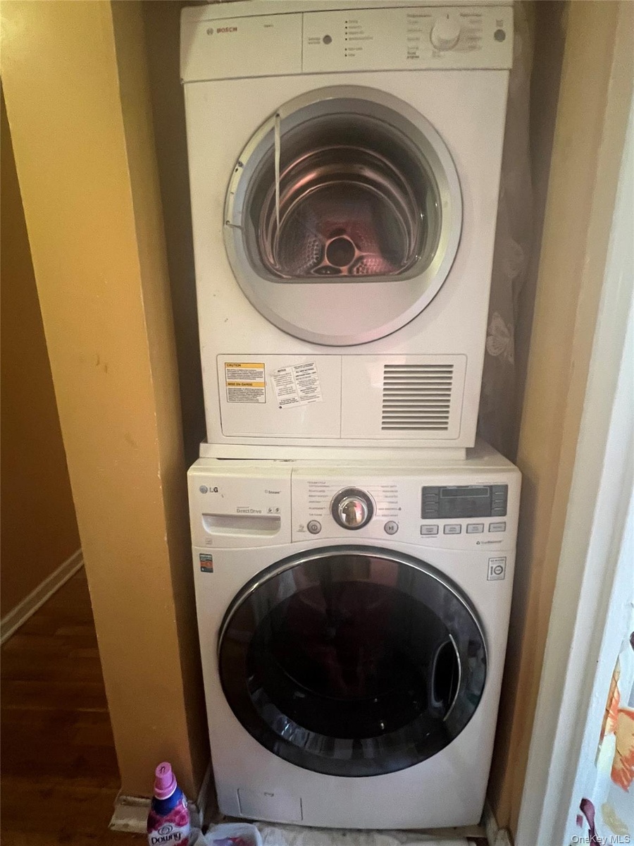 - Washroom featuring stacked washing machine and dryer and wood finished floors
