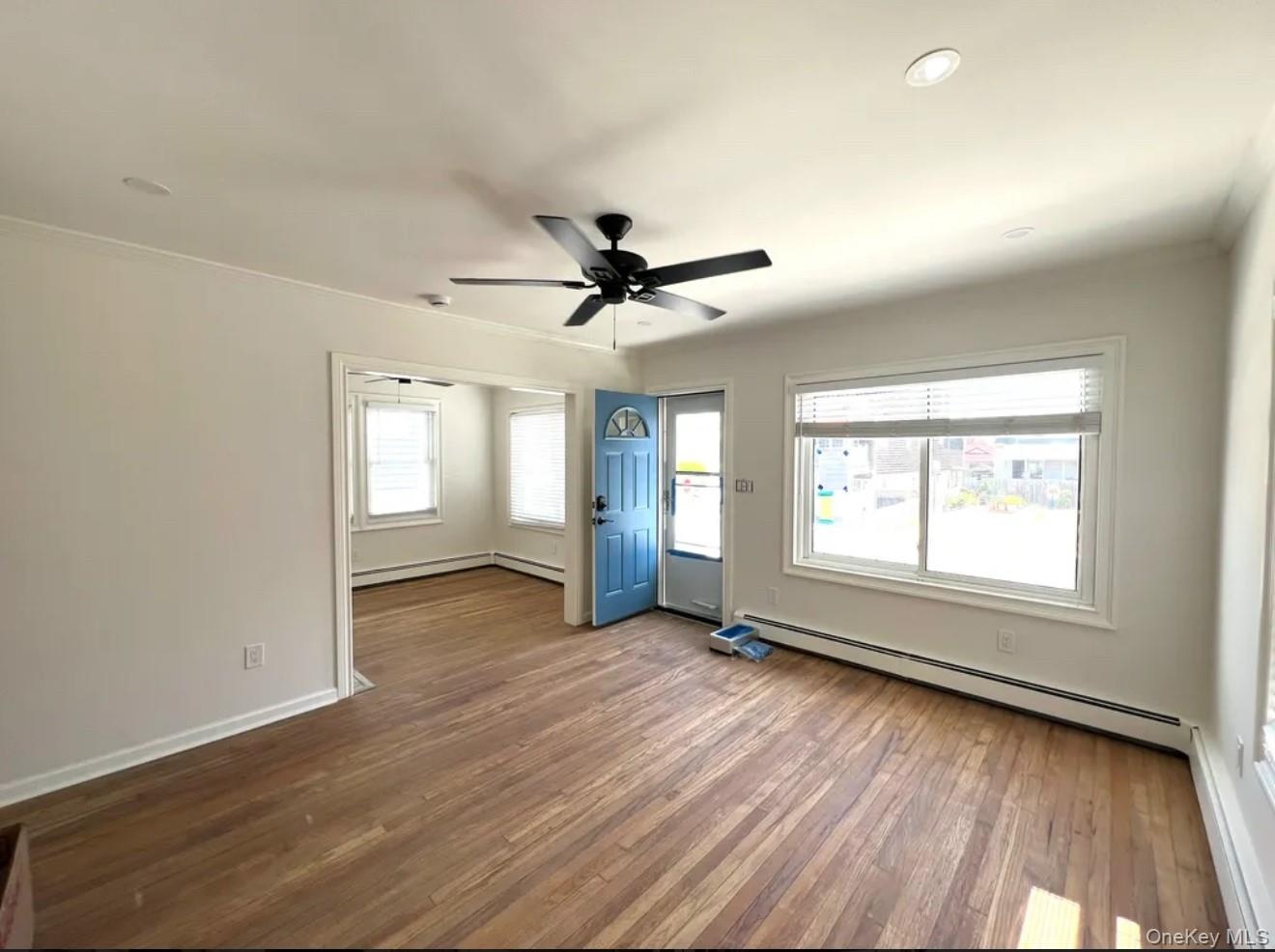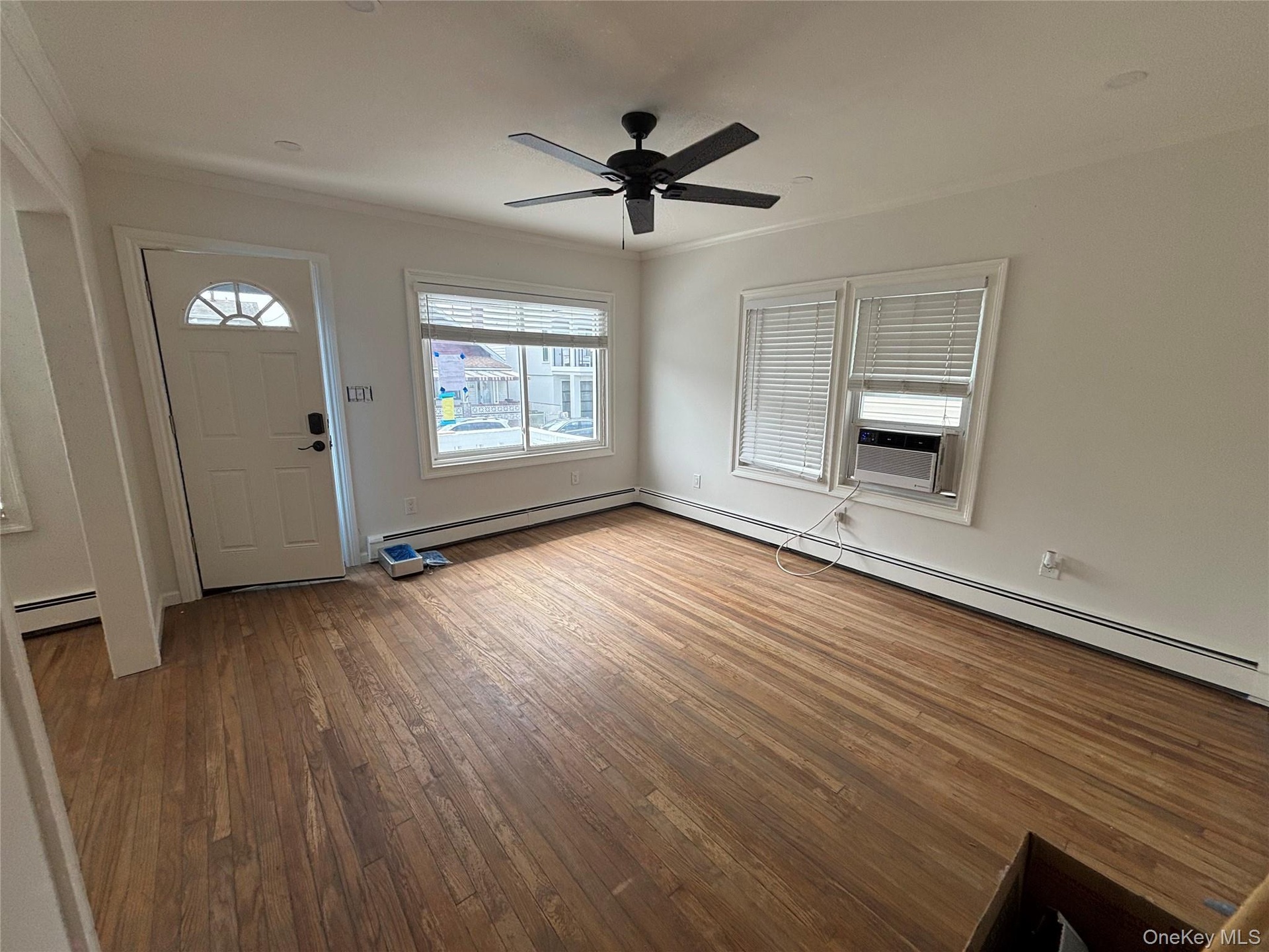 - Foyer entrance featuring hardwood / wood-style floors, ornamental molding, a ceiling fan, and a baseboard radiator